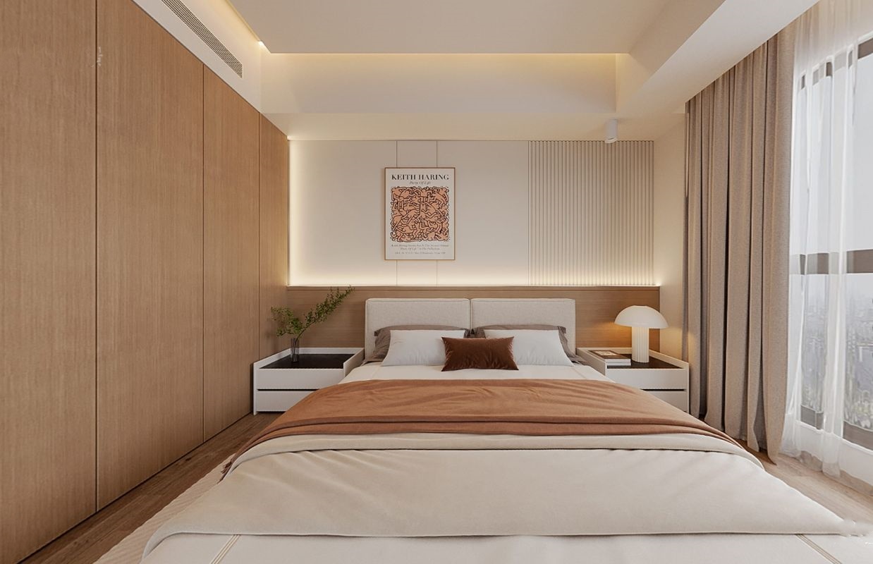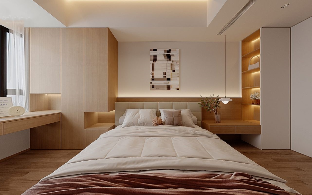 卧室通铺木地板,床头背景墙做半墙木质护墙板,搭配同色系定制柜,以温润简约的风格,寻觅心灵休憩的港湾。