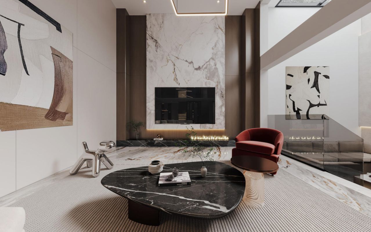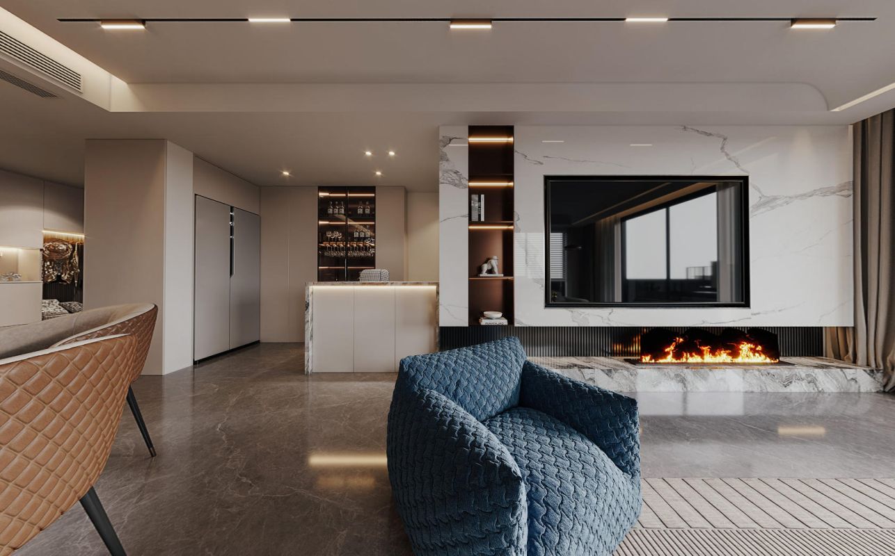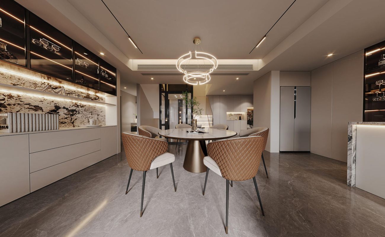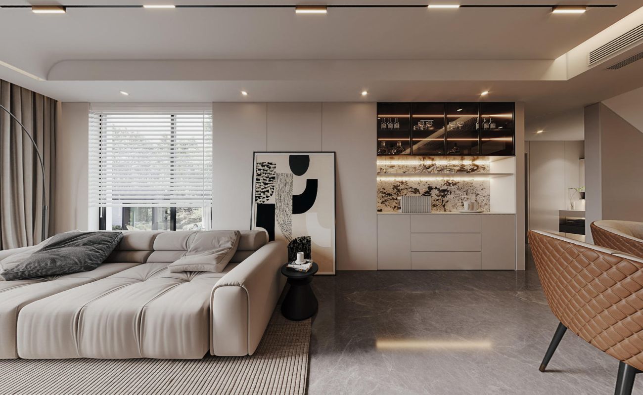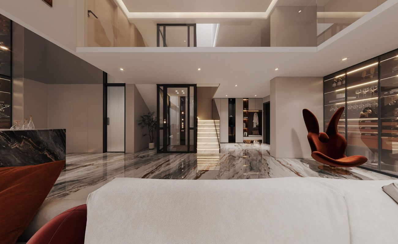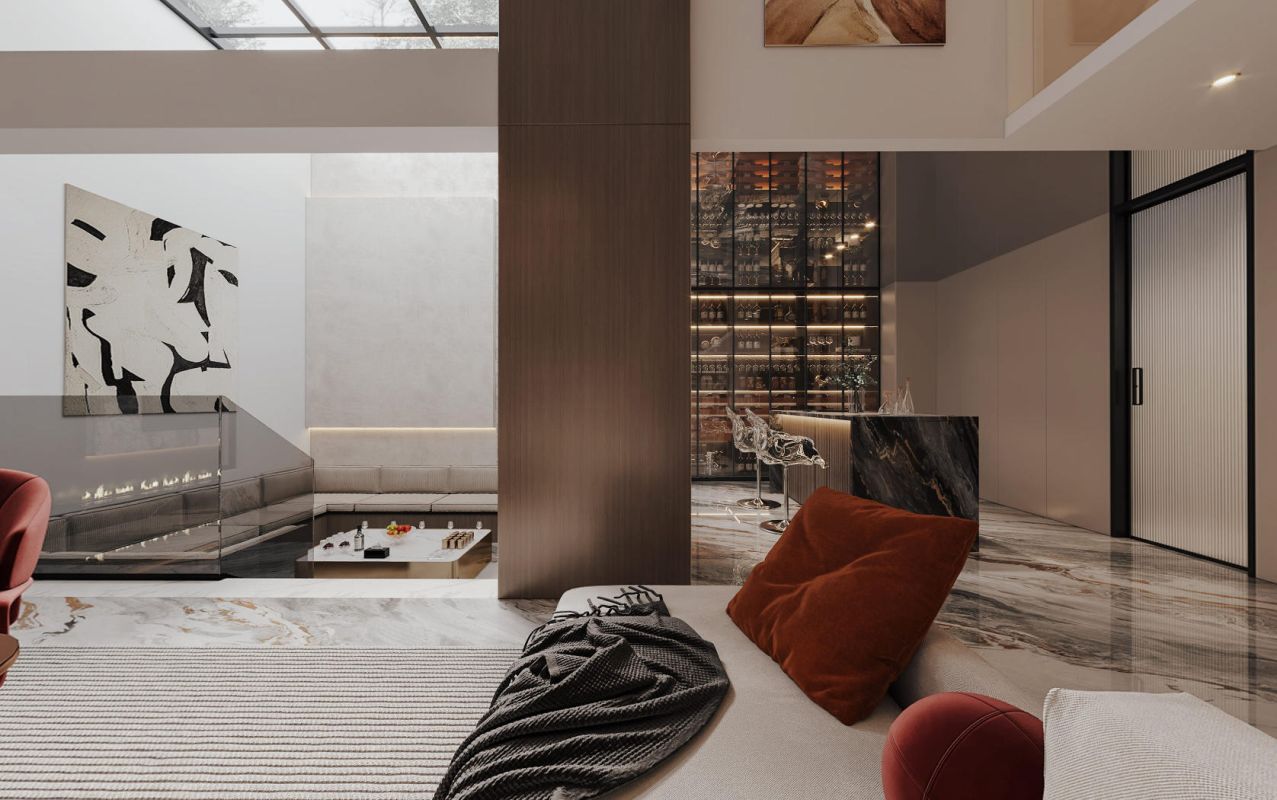 天窗将自然光引入,其正下方是方正围合的下沉式沙发区,一侧是高挑空的电视墙,拉伸着空间的视觉尺度;通透的到顶定制酒柜,通过镜面天花拉伸视觉层高,与精致的吧台无缝衔接。