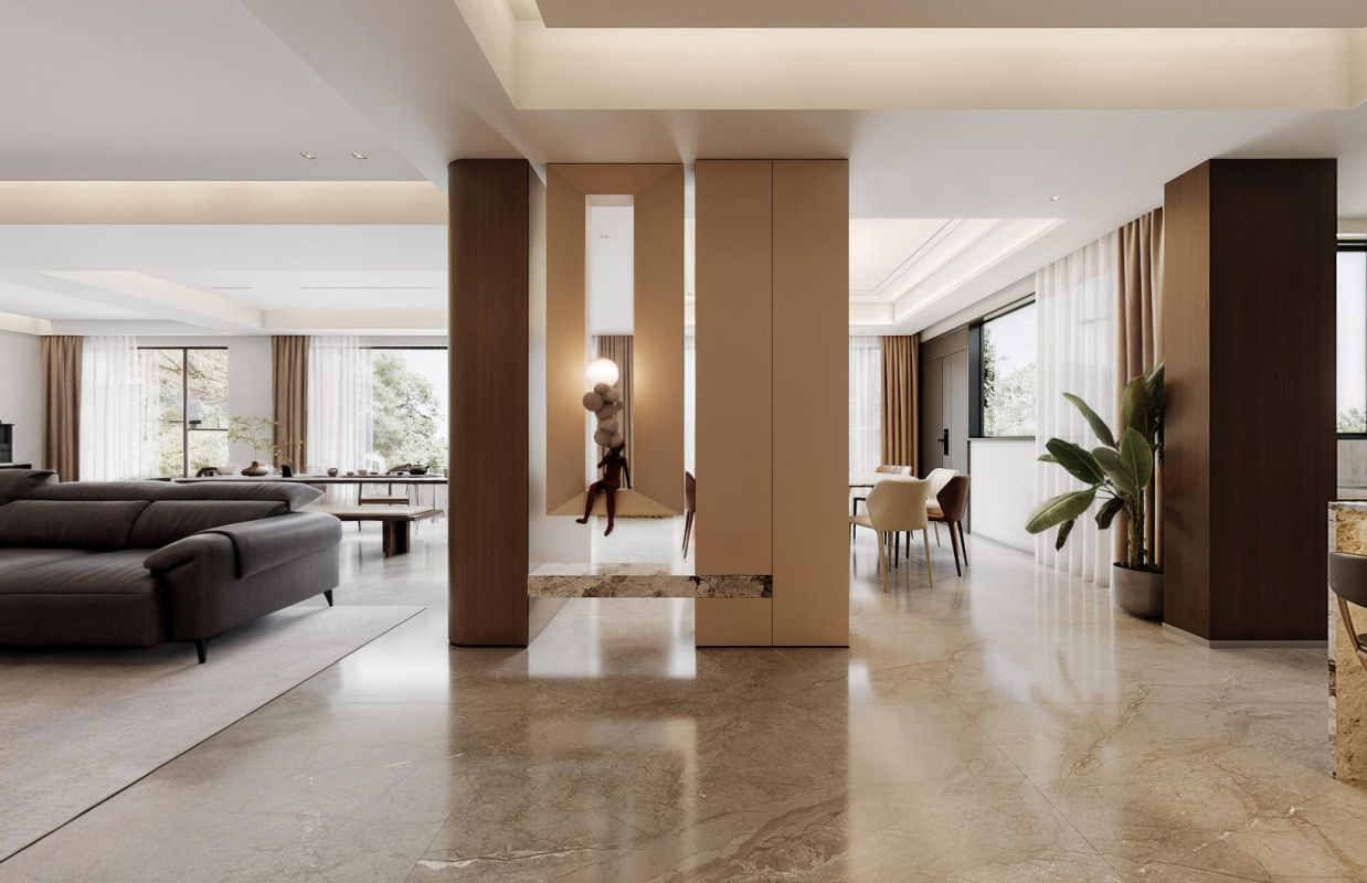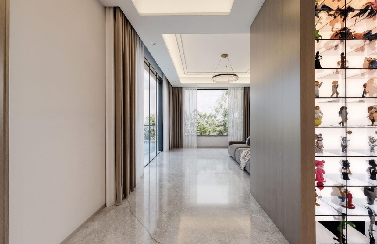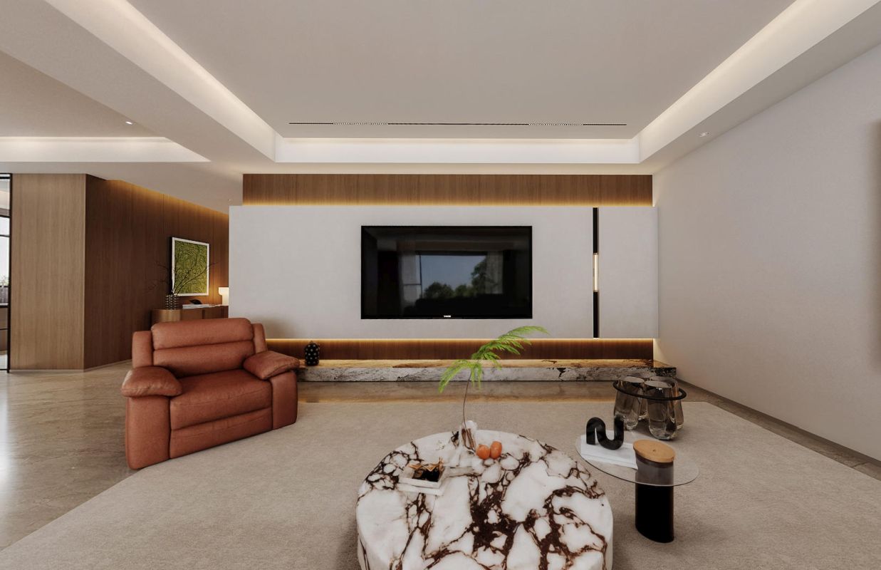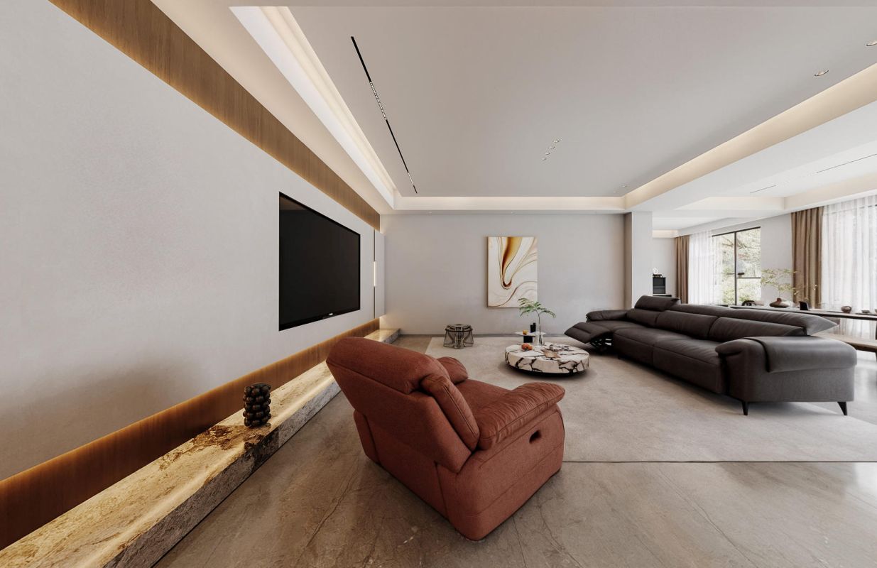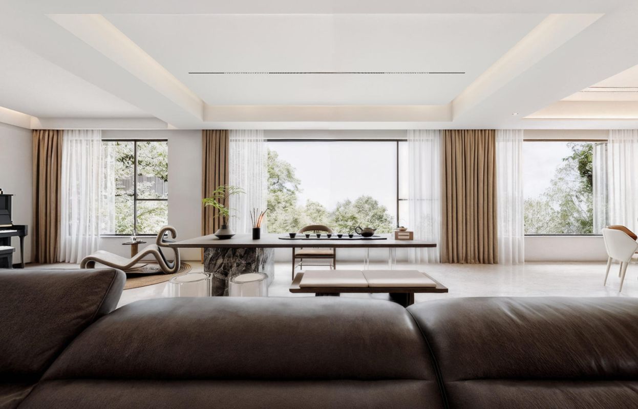 客餐厅、茶室与半开放式厨房共同围合出一个通透开阔的全屋活动场域,赋予大宅松弛自如的氛围。全屋采用无主灯设计,搭配原木色墙板有效拉伸层高视觉;