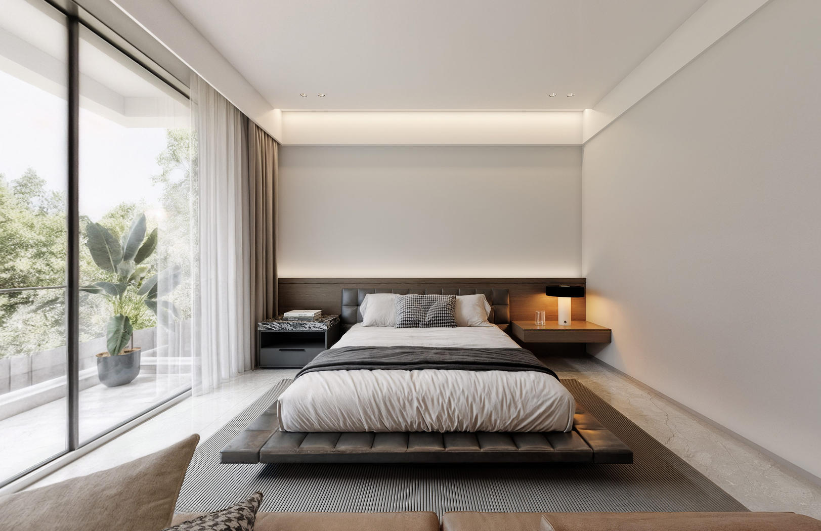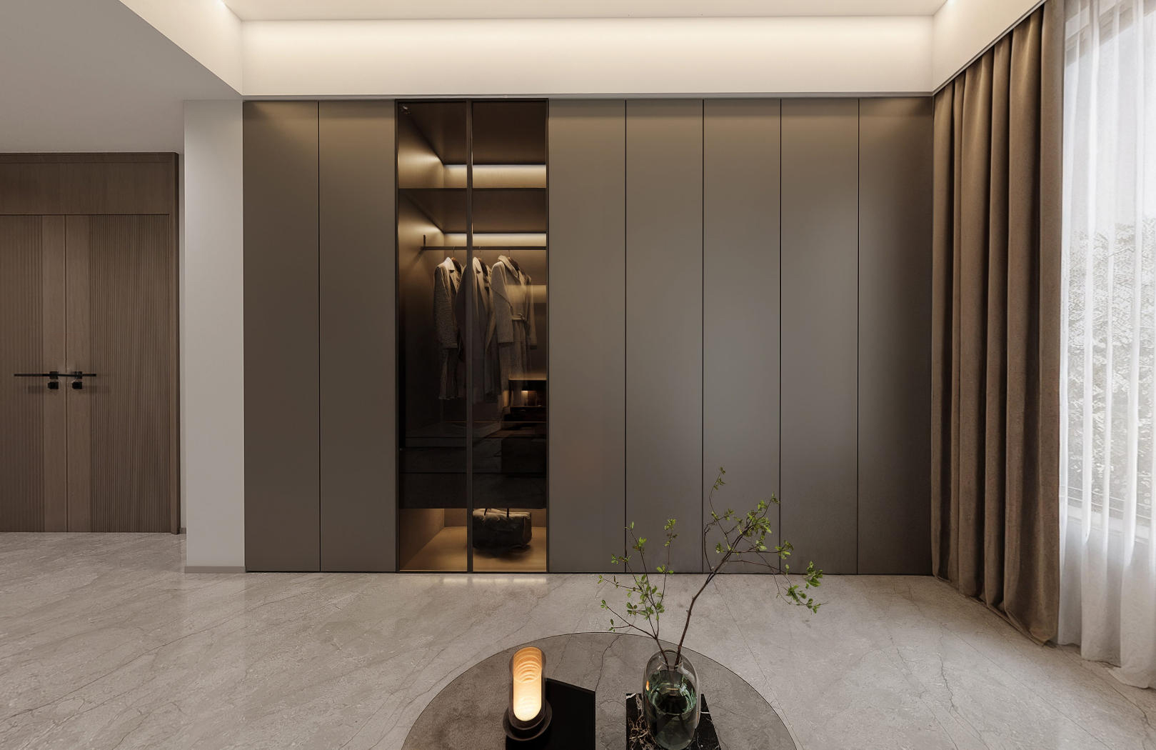 主卧采用开放式布局,串联起睡眠区与观景露台,搭配无主灯与氛围光带,共同营造出温馨而静谧的休憩氛围。