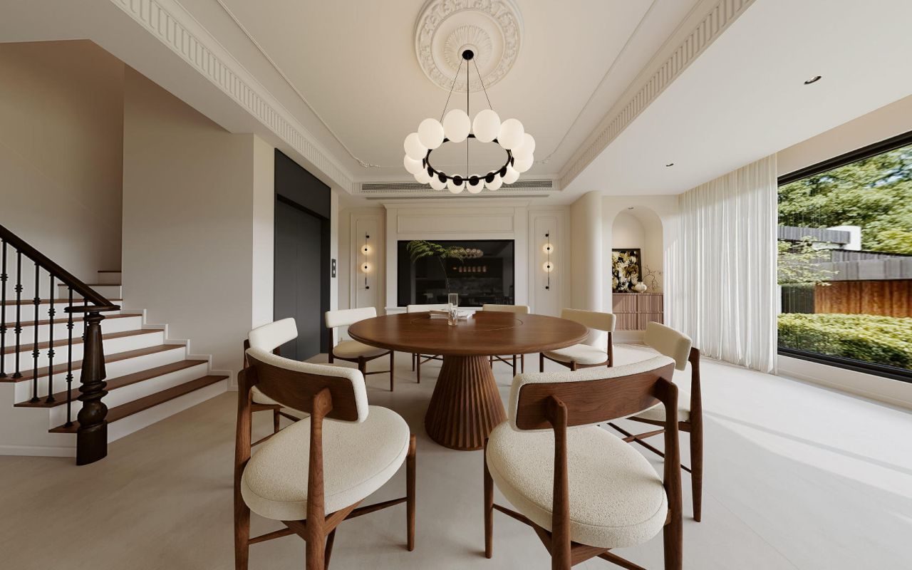 圆形餐桌宛如一颗温润的明珠,镶嵌在空间之中,岛台冷峻的纹理与周围的柔和色调形成微妙的对比,既是料理的工作台,也是家人相聚的温馨角落。