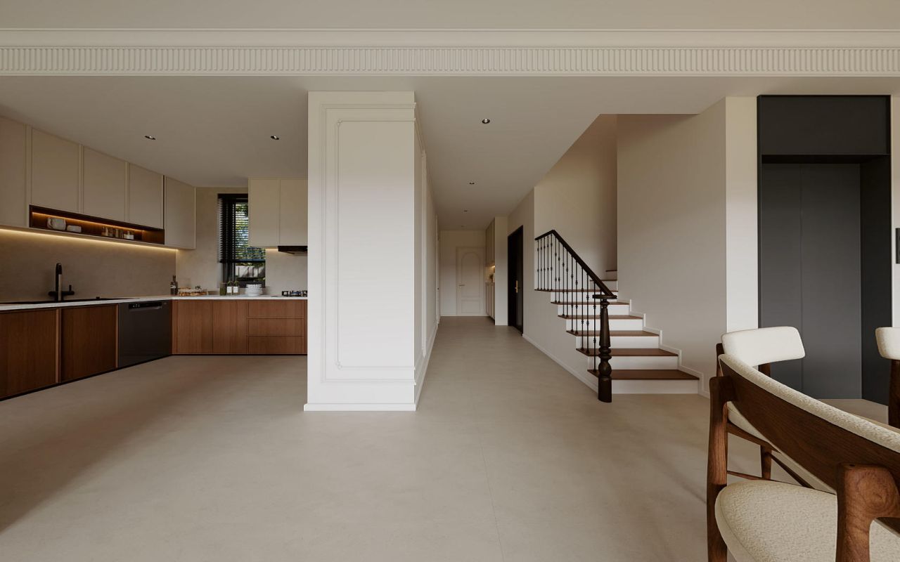 开放式厨房与餐厅自然衔接,米色与木色交织的橱柜,以简洁的线条诠释法式优雅。