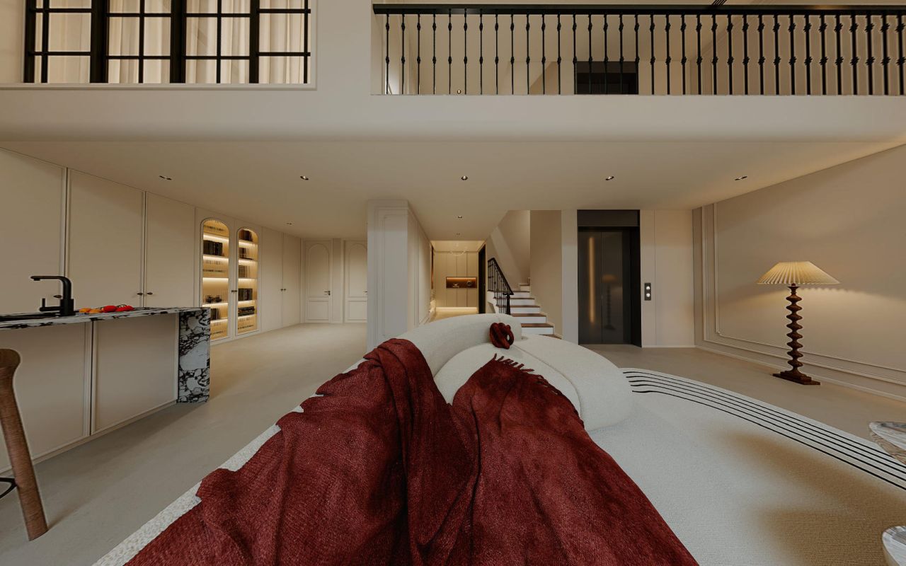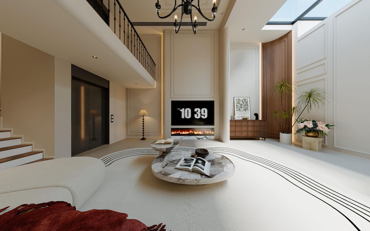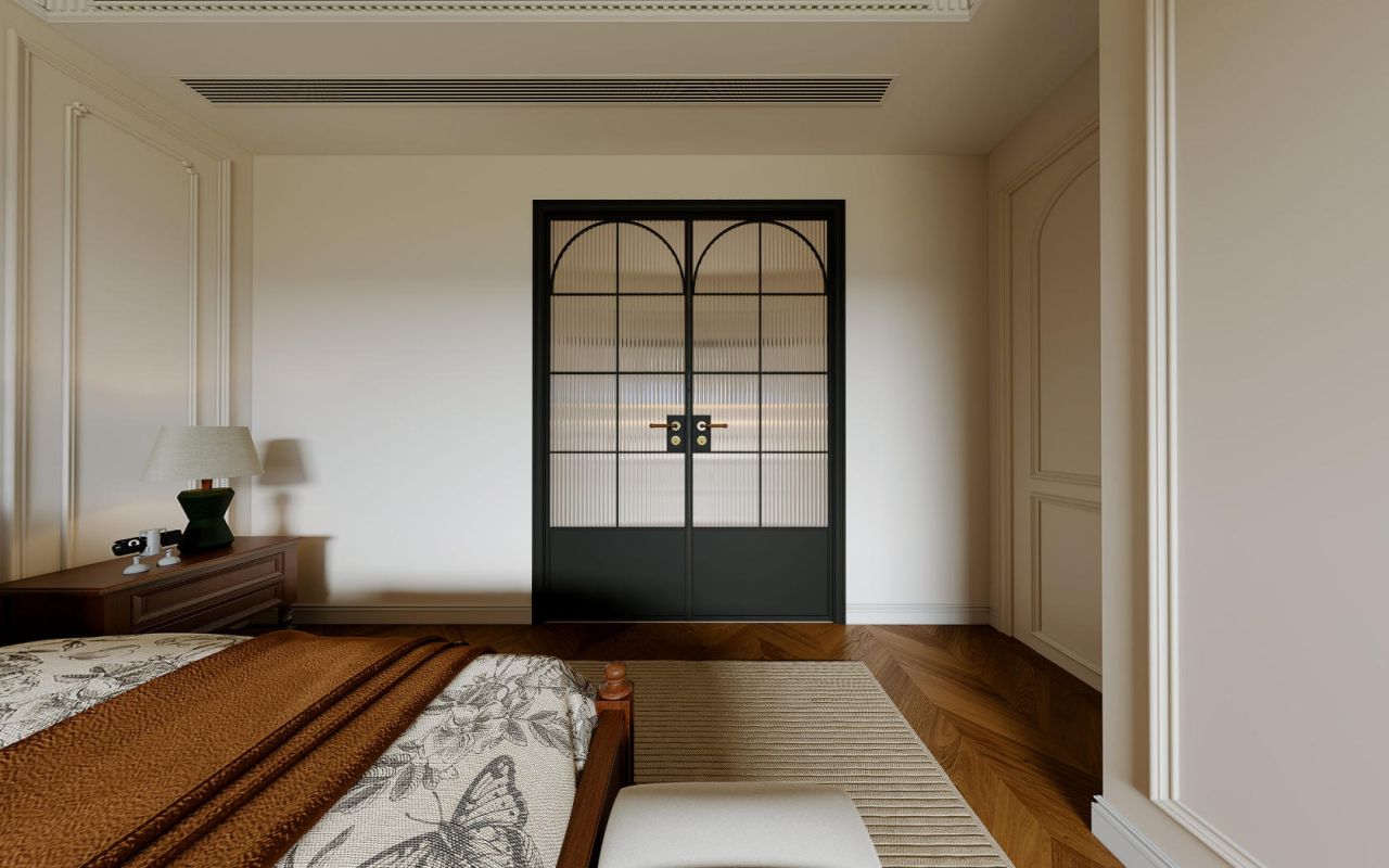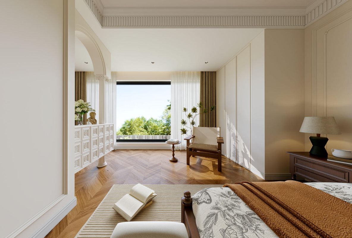 米白色的墙面与精致的雕花相映成趣,线条简洁却不失典雅,仿佛在轻声诉说着法式的浪漫风情。棕色的木质地板呈鱼骨形铺展,以自然的纹理诉说着岁月的故事,每一步都踏出温暖的回应。