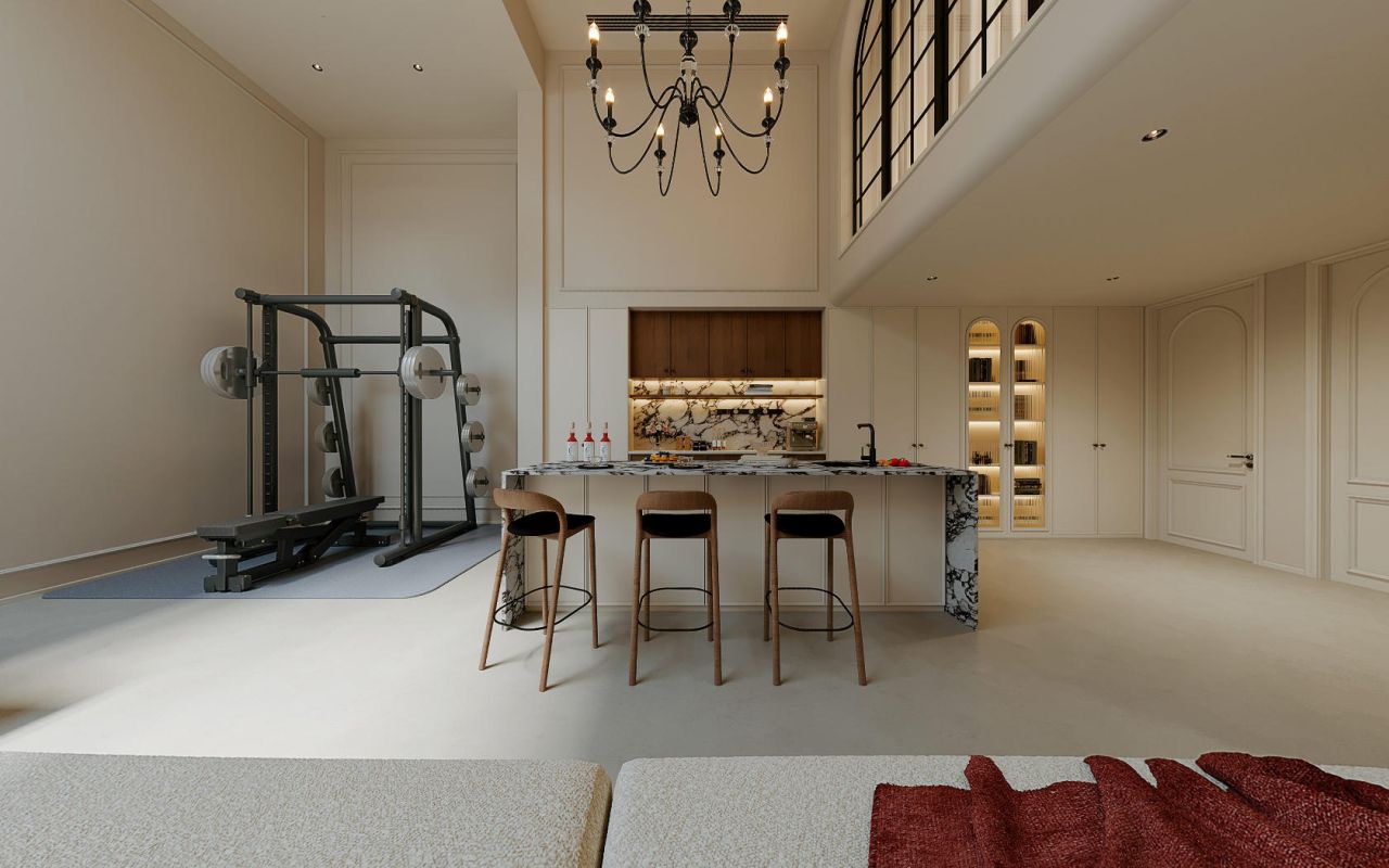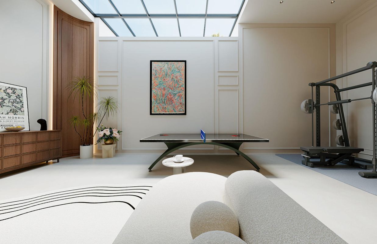 地下室是将会客、休闲、娱乐与健身巧妙融合的多维空间,挑高的空间因天窗的巧妙设计而格外通透。墙上的艺术画与角落的绿植、花束,以恰到好处的点缀,让地下空间充满生机与雅致。