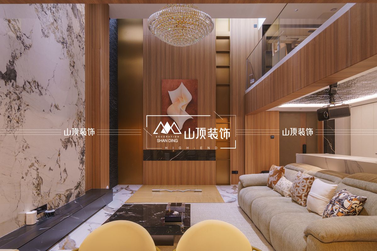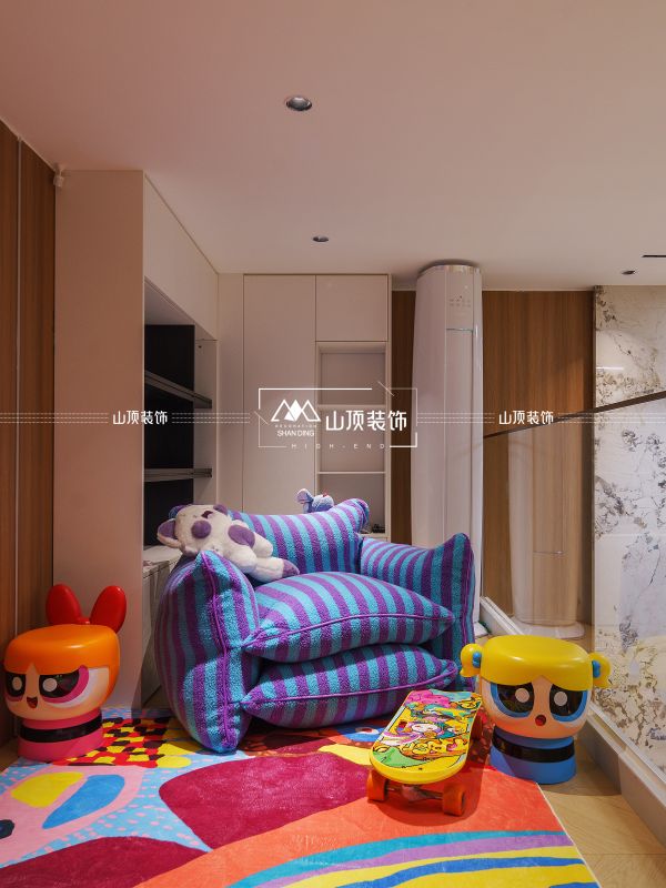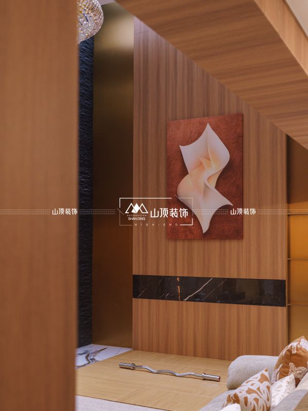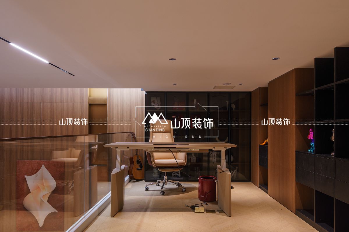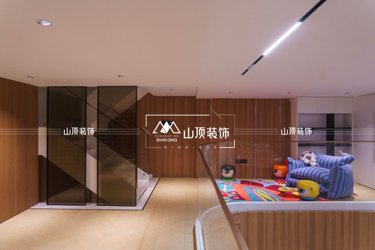 地下室空间凭借挑高设计尽显大气磅礴。步入其中,豪华水晶吊灯自高处垂落,熠熠生辉。大理石花纹的墙面与地板相互映衬,纹理自然,质感十足,尽显高雅格调。一侧的茶室区域,精致茶具摆放于绿色桌案之上,营造出静谧的品茗氛围。 木纹地砖通铺营造温润基调,儿童休闲区内,彩绘绒布地毯与蓝紫色拼接条纹沙发勾勒出活泼氛围。透明金边玻璃围栏,可将视野延伸至负一层。 紧邻的办公区沿墙设置通顶柜,黑色玻璃展柜陈列着证书与艺术品,搭配米色办公桌椅,兼顾实用与美观。