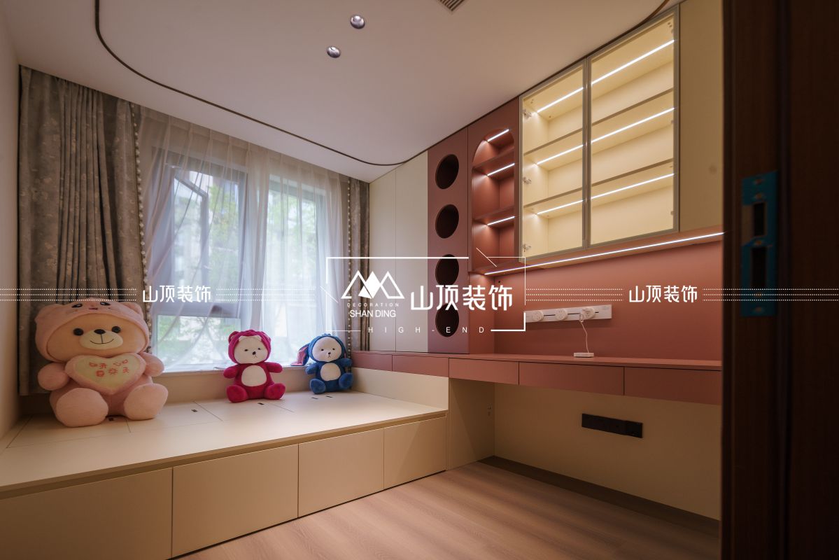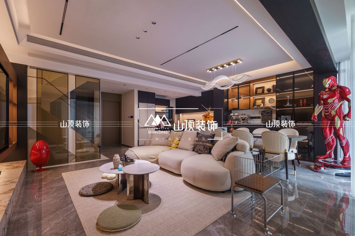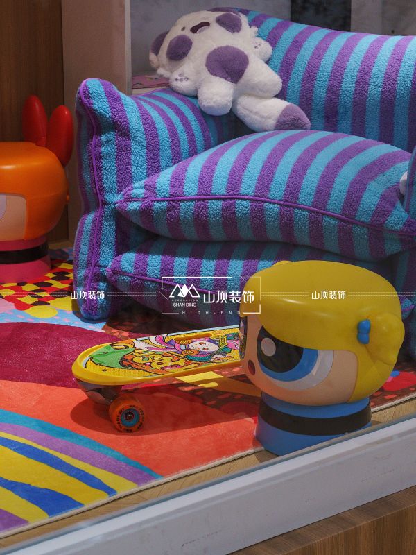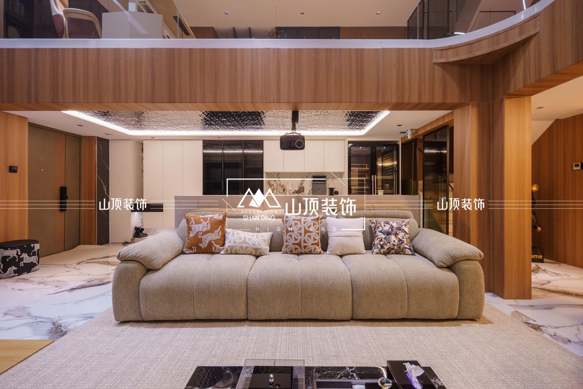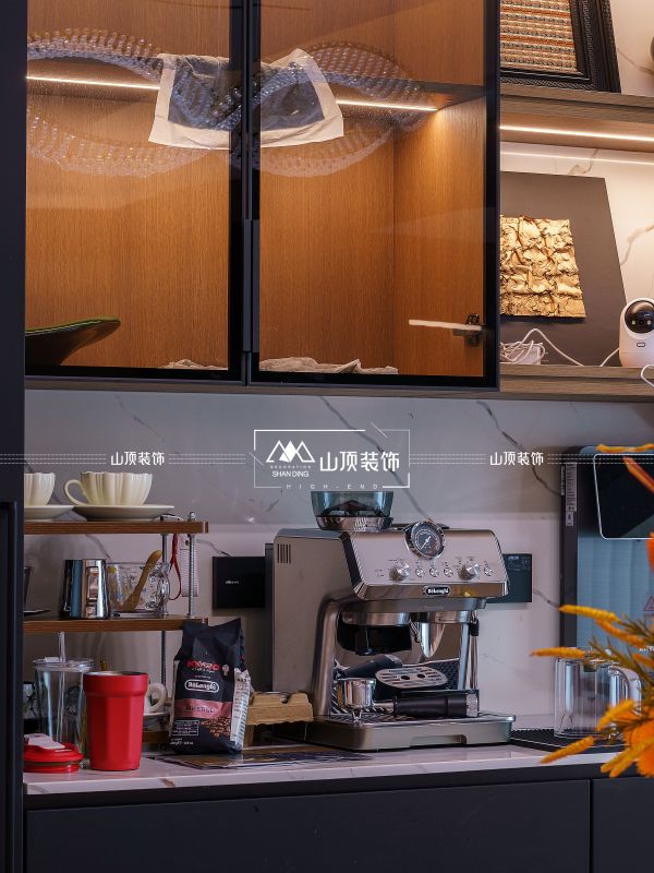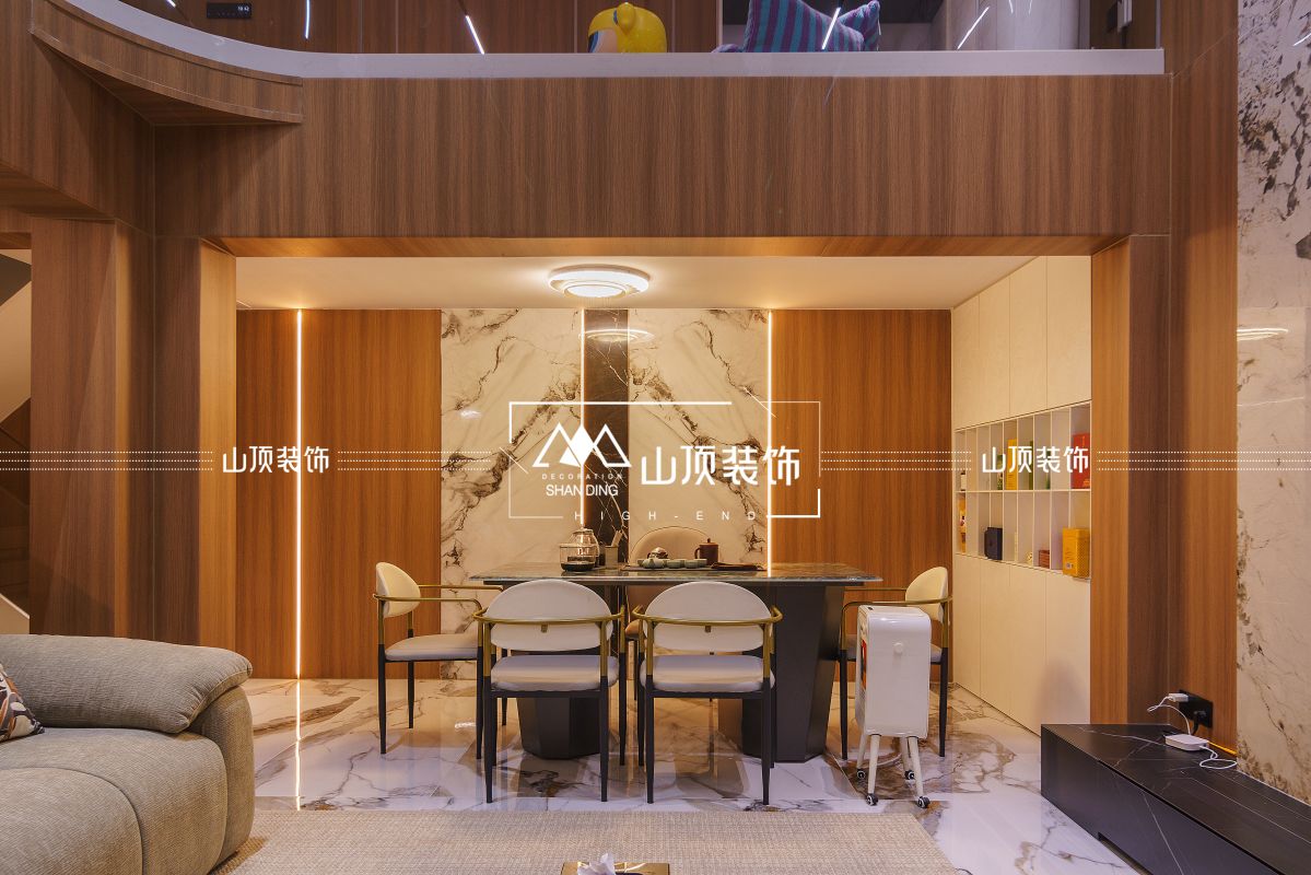 地下室空间凭借挑高设计尽显大气磅礴。步入其中,豪华水晶吊灯自高处垂落,熠熠生辉。大理石花纹的墙面与地板相互映衬,纹理自然,质感十足,尽显高雅格调。一侧的茶室区域,精致茶具摆放于绿色桌案之上,营造出静谧的品茗氛围。 木纹地砖通铺营造温润基调,儿童休闲区内,彩绘绒布地毯与蓝紫色拼接条纹沙发勾勒出活泼氛围。透明金边玻璃围栏,可将视野延伸至负一层。 紧邻的办公区沿墙设置通顶柜,黑色玻璃展柜陈列着证书与艺术品,搭配米色办公桌椅,兼顾实用与美观。