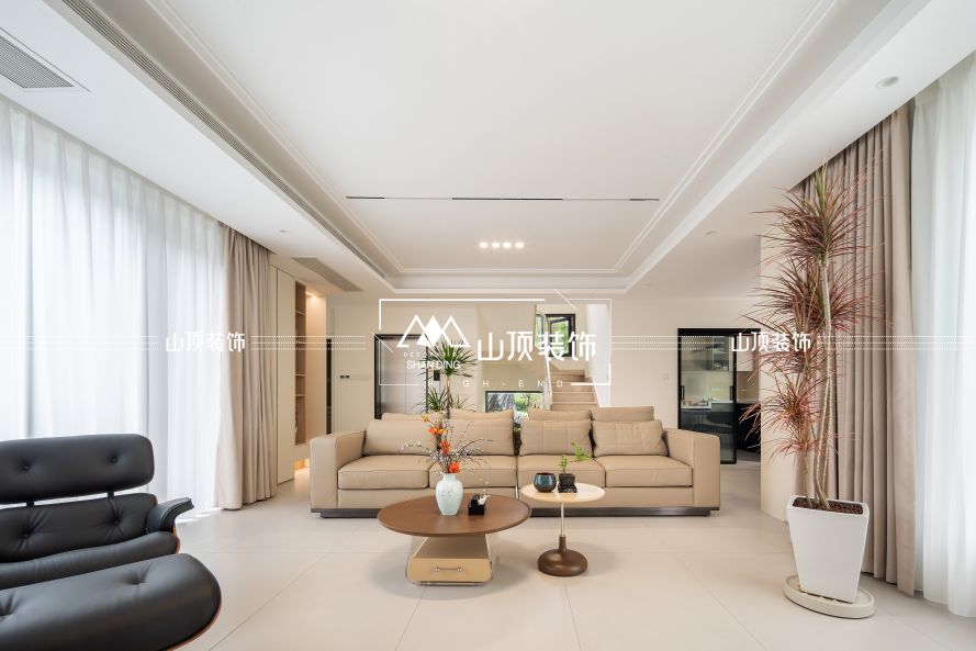 空间布局开放而通透,大面积的落地窗引入充足的自然光线,让整个空间明亮而通透,视野开阔,仿佛将室外的风景也纳入家中。低饱和度的沙发,线条简洁流畅,坐感舒适,既符合现代简约的审美,又不失温馨的家庭氛围。电视背景墙采用简洁的白色为主色调,搭配黑色的液晶电视,形成鲜明的对比,摆放的艺术器皿体现了屋主的审美品味。