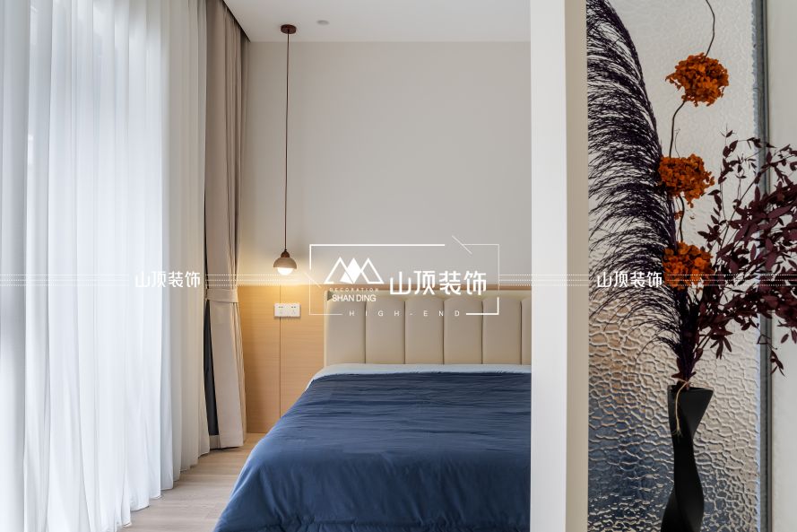 步入卧室,一个的静谧空间,磨砂屏风保持静谧与隐私感,满墙衣柜,设计简洁而高效,保持了卧室的整洁与开阔。