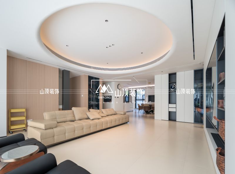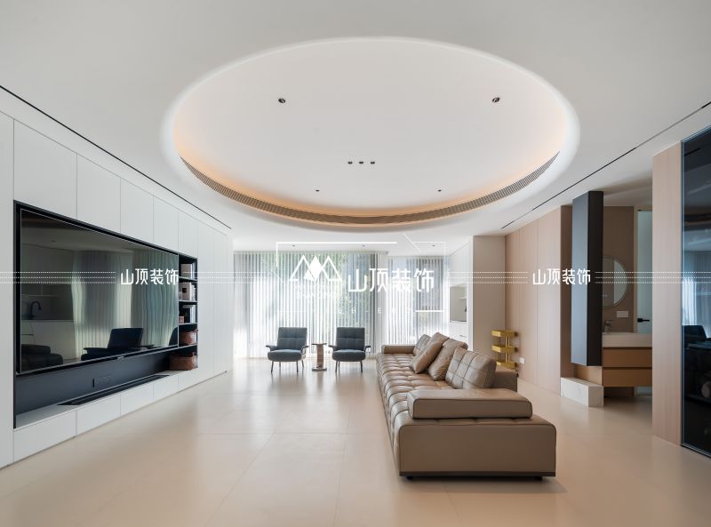 温和色调的护墙板让家赏心悦目。半隐藏式卫生间,灵活立体的奥妙,让空间更加生动。圆形吊顶专门定做模具制成,内嵌灯带,强调层次感。储物柜与含加湿器的地台,电视墙不再单调。
