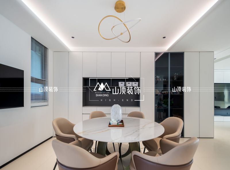 餐厅与客厅之间动线流畅,圆桌与吊灯相得益彰,墙上电视方便聚会时互动,增进感情。
