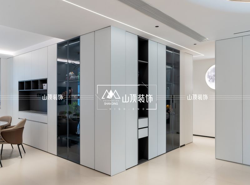 L型整墙储物柜,立方体与墙面的巧妙结合,将餐边柜与书柜紧密连接。