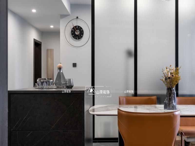 。餐桌与岛台以黑白色系的大理石材质制造观感反差,同时用经典爱马仕橙餐椅点缀空间情绪,营造更为温馨、舒适的家庭陪伴氛围。