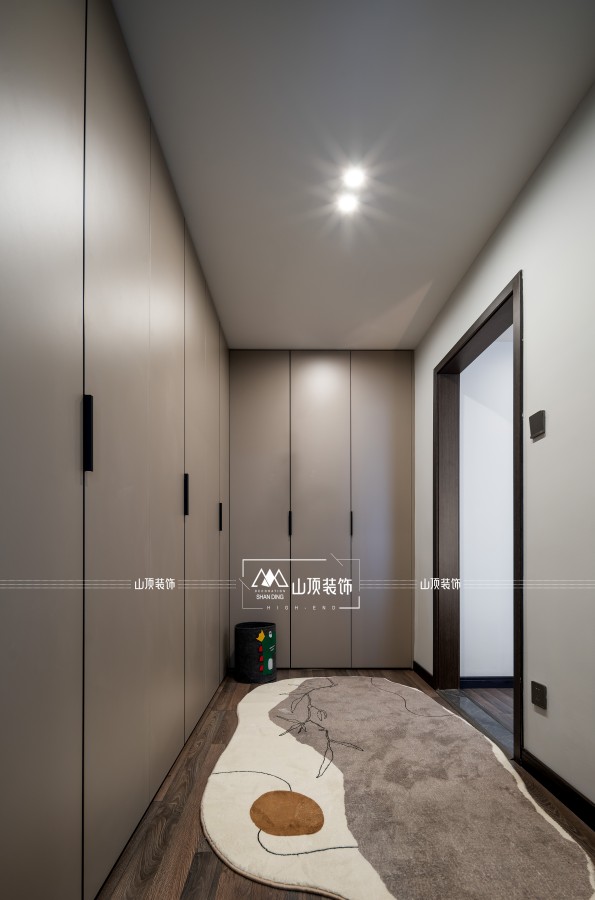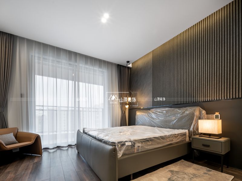 卧室作为相对私密的空间,将功能性与舒适度相结合,利用床头吊灯、台灯以及灯槽的光来补足卧室的氛围感。墙面的竖隔栅肌理打破灰色墙面的枯燥乏味,为大面积灰色加入肌理,增添趣味性。