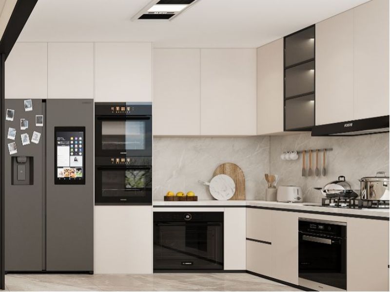 圆桌与高脚椅似晚宴上的酒杯,象牙白的水吧台嵌入黑经典黑白的一处新意在几乎透明的吊灯下焕发优雅的质感。嵌入式电器,L型灶台适合家的走向简洁,无需繁复,明亮,无需华灯,这就是家的模样,在简约中寻得安宁。