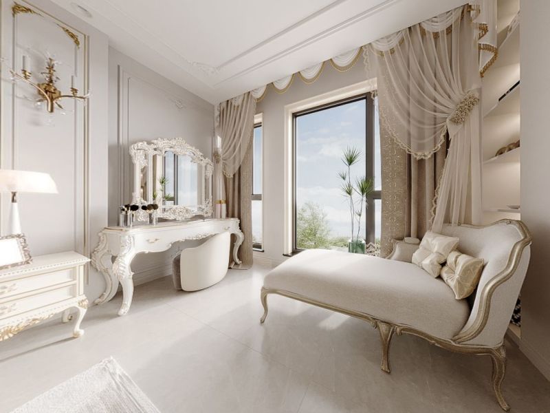 餐厅秉持典型的法式风格搭配原则,餐桌和餐椅均为米白色,表面略带雕花。配合扶手和椅腿的弧形曲度,显得优雅矜贵,空间中浪漫清新之感扑面而来。