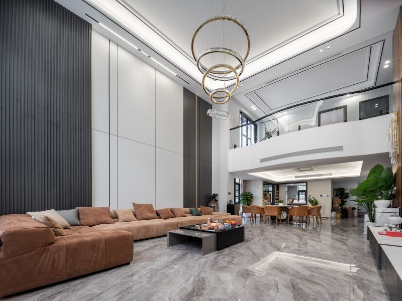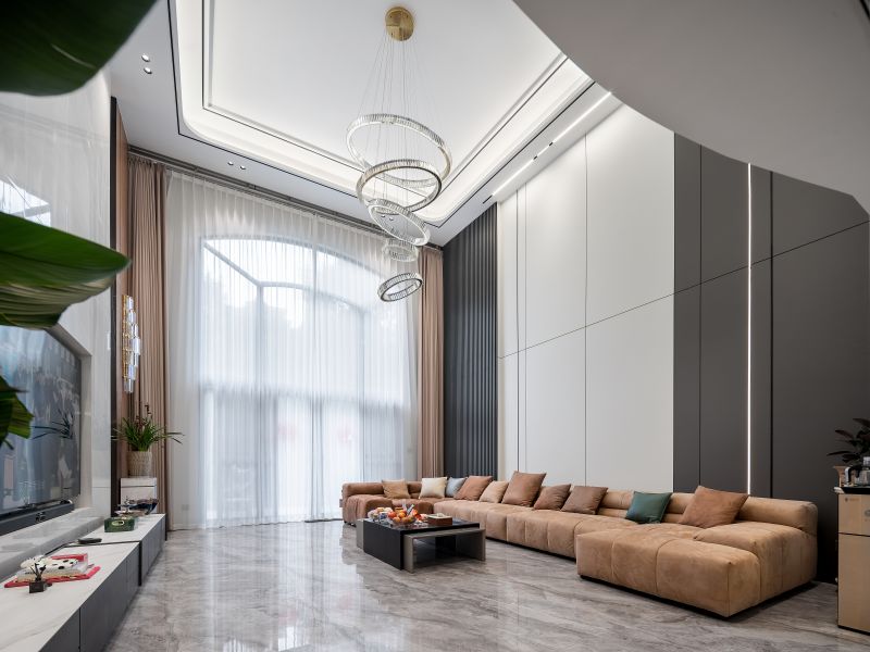 空间整体色调以灰白为主,简洁干净,通透明亮,挑高客厅搭配上大型环形吊灯,既不显压抑,也不觉空旷。边顶设计,搭配上黑钛金线条,四周嵌入筒灯。