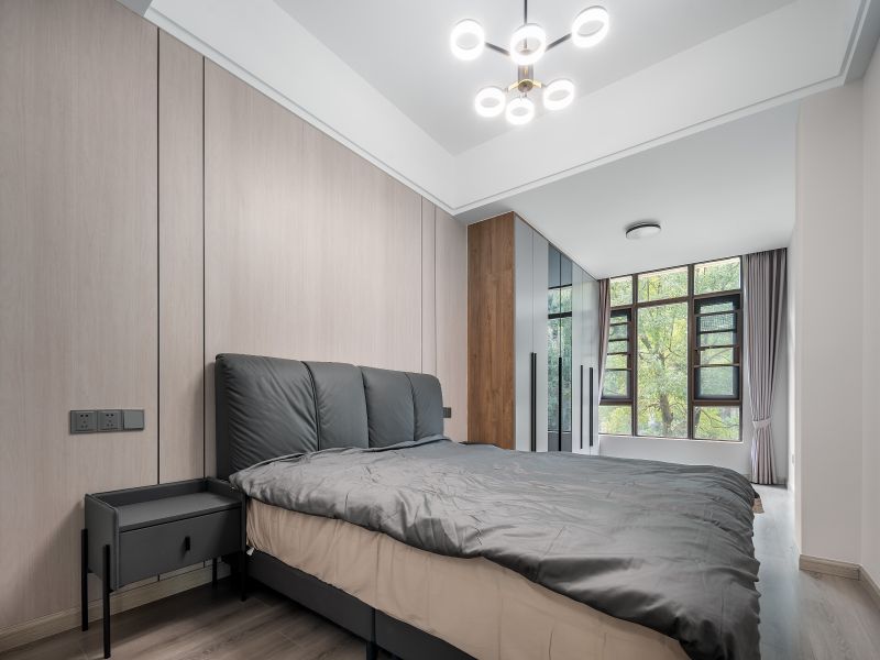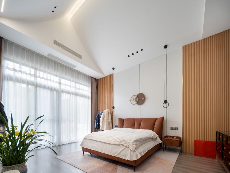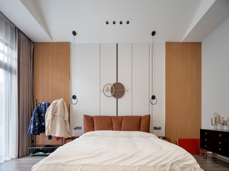 床头背景墙采用白色护墙板搭配暖橙色格栅板,将冷暖两种色调进行中和,让空间纯净而温馨。