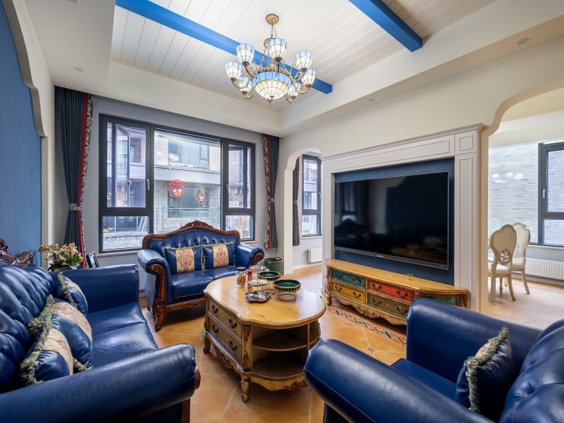 假梁与勾缝石膏板搭建的吊顶,蓝白相间,典型的地中海风格家具,搭配上拱形门洞、弧形背景墙假梁与勾缝石膏板搭建的吊顶,蓝白相间,让空间四处散发着浓郁的地中海风情。