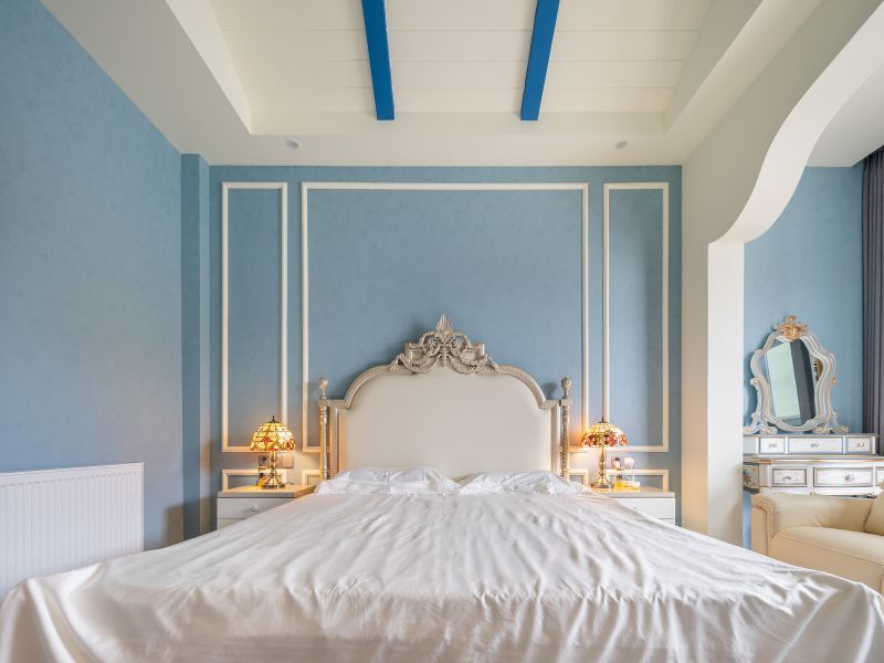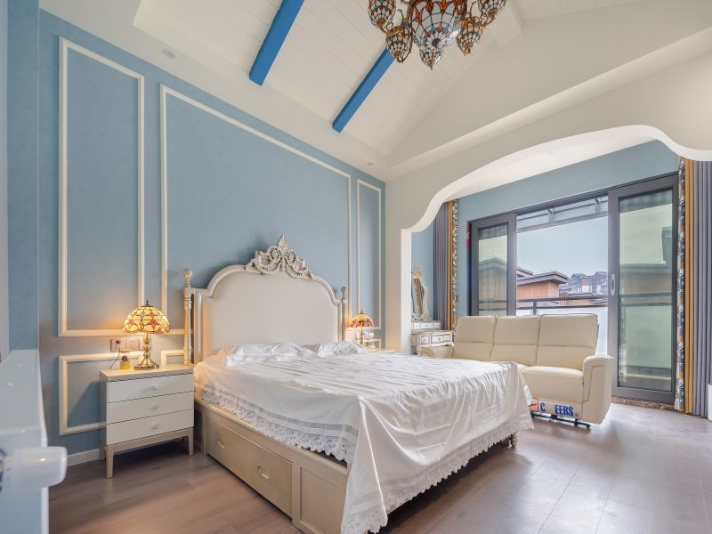 用坡屋顶来缓和层高过高所带来的空旷感,蓝色假梁搭配石膏板,仿若触手可及的蓝天白云,勾勒出天空的痕迹,编织成梦境。