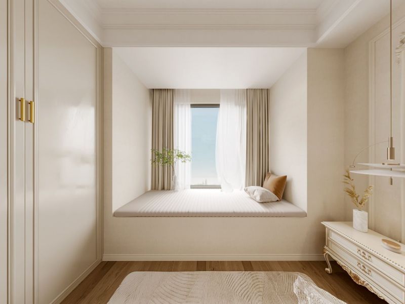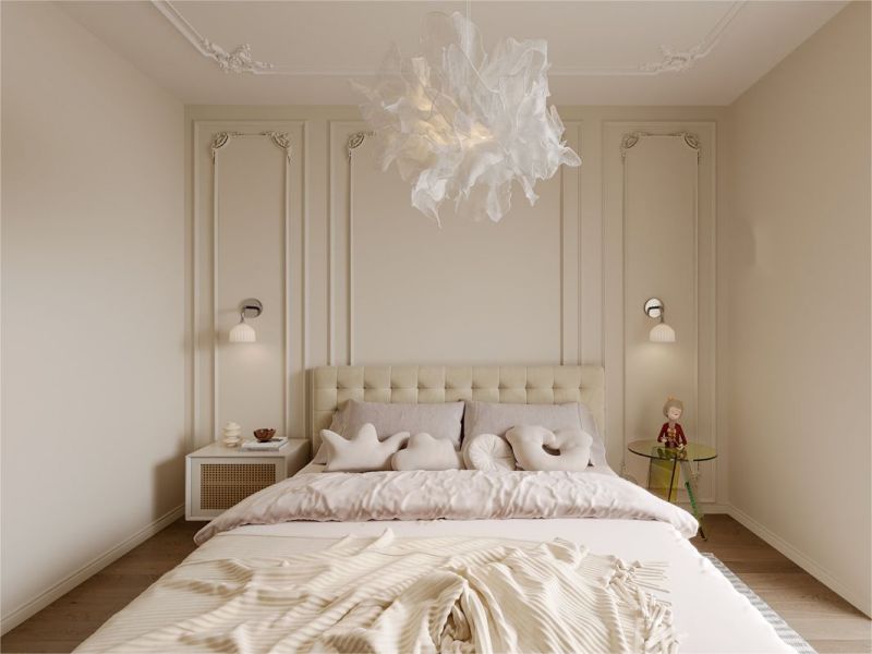 主卧空间延续法式设计的温柔格调,整个色调和谐中带着一丝法式浪漫风情,灯具的云朵造型让整个空间充满艺术气息。
