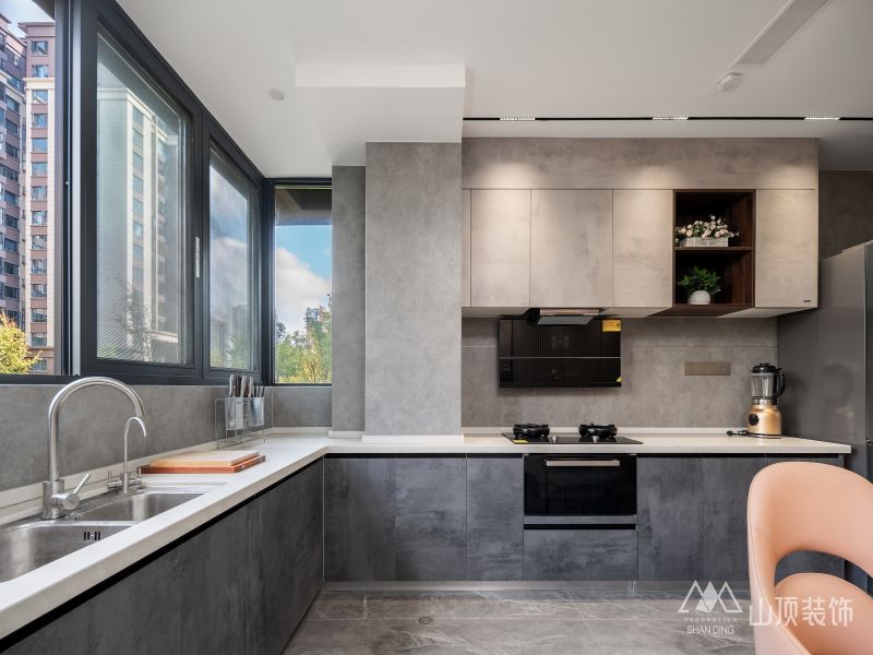 餐厨一体化,采用L型厨房设计,冷暖色调中和,不同材质交叉碰撞,融合光与影的双重烘托与点缀,让整个空间简洁舒适,静谧优雅。