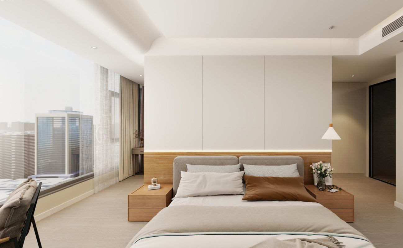 卧室以现代简约风格勾勒,整体色调柔和而温馨。米白色墙面映衬着浅木色家具,交织出宁静舒适的休憩氛围。整面落地窗迎入丰沛天光,将窗外城市景观尽收眼底,空间更显开阔通透。
