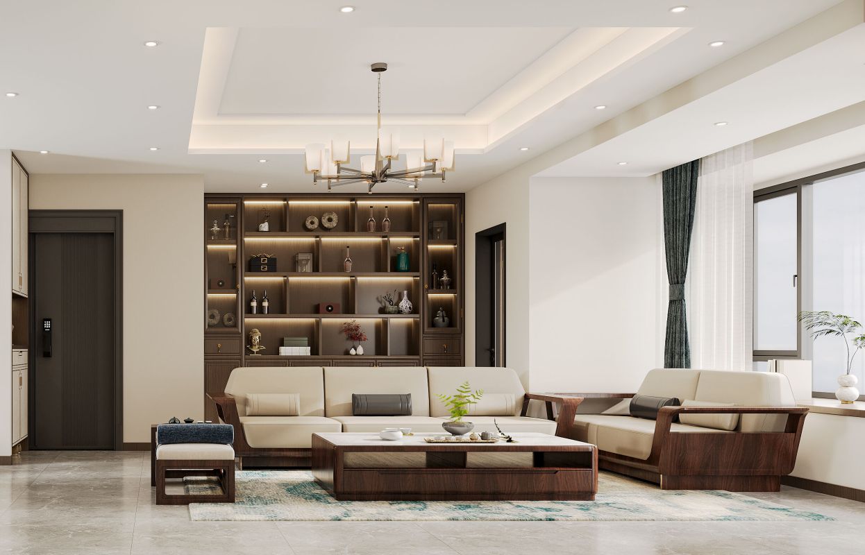 客厅呈现出一种含蓄而内敛的美感,整体空间以温润的木质色调为主基调。沙发呈围合状放置,不仅有利于人们之间的交流互动,更体现出中式传统家庭团聚、和睦相处的文化内涵。