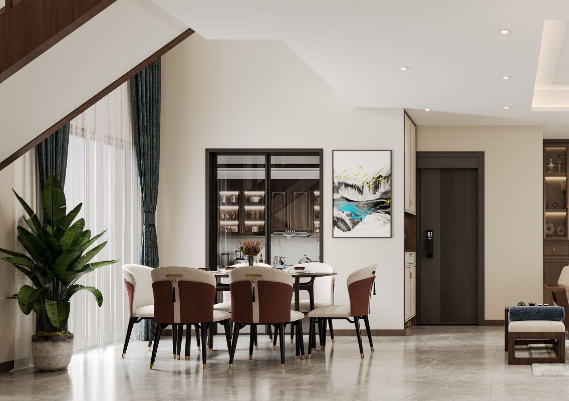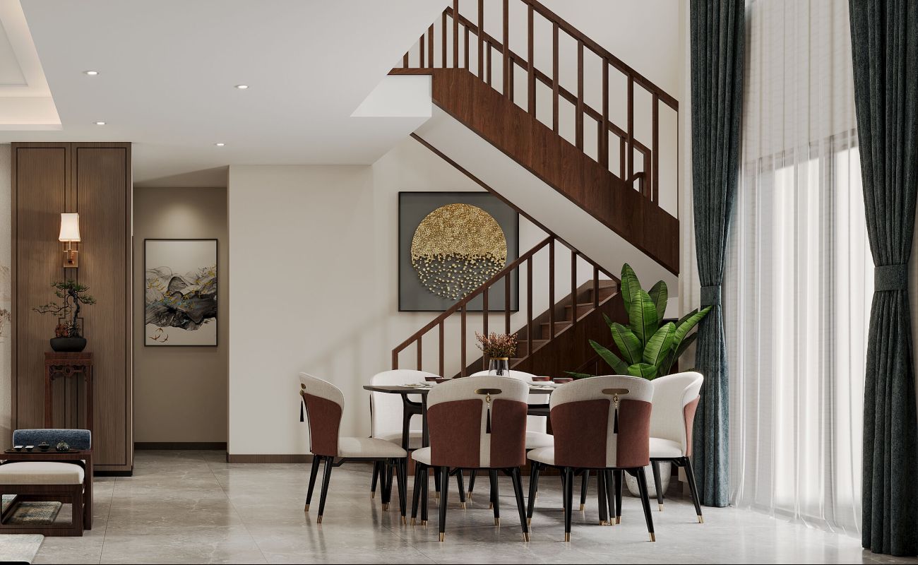 深色木质楼梯庄重典雅,承载着中式风格的深厚底蕴。大面积浅色基底,给人以轻盈之感,打破了人们对中式风刻板、老气的印象,将传统与现代完美融合。