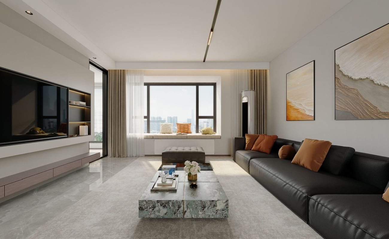 客厅的设计摒弃冗余,墙面和地面以素色为基调,使整个空间显得明净且通透。一张极简的沙发、一方有质感的茶几,使理性与温度相融合,营造出恰到好处的生活质感。