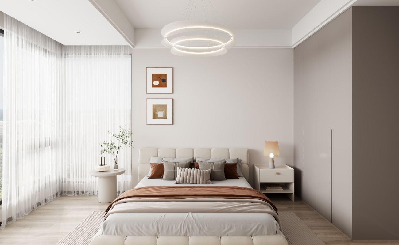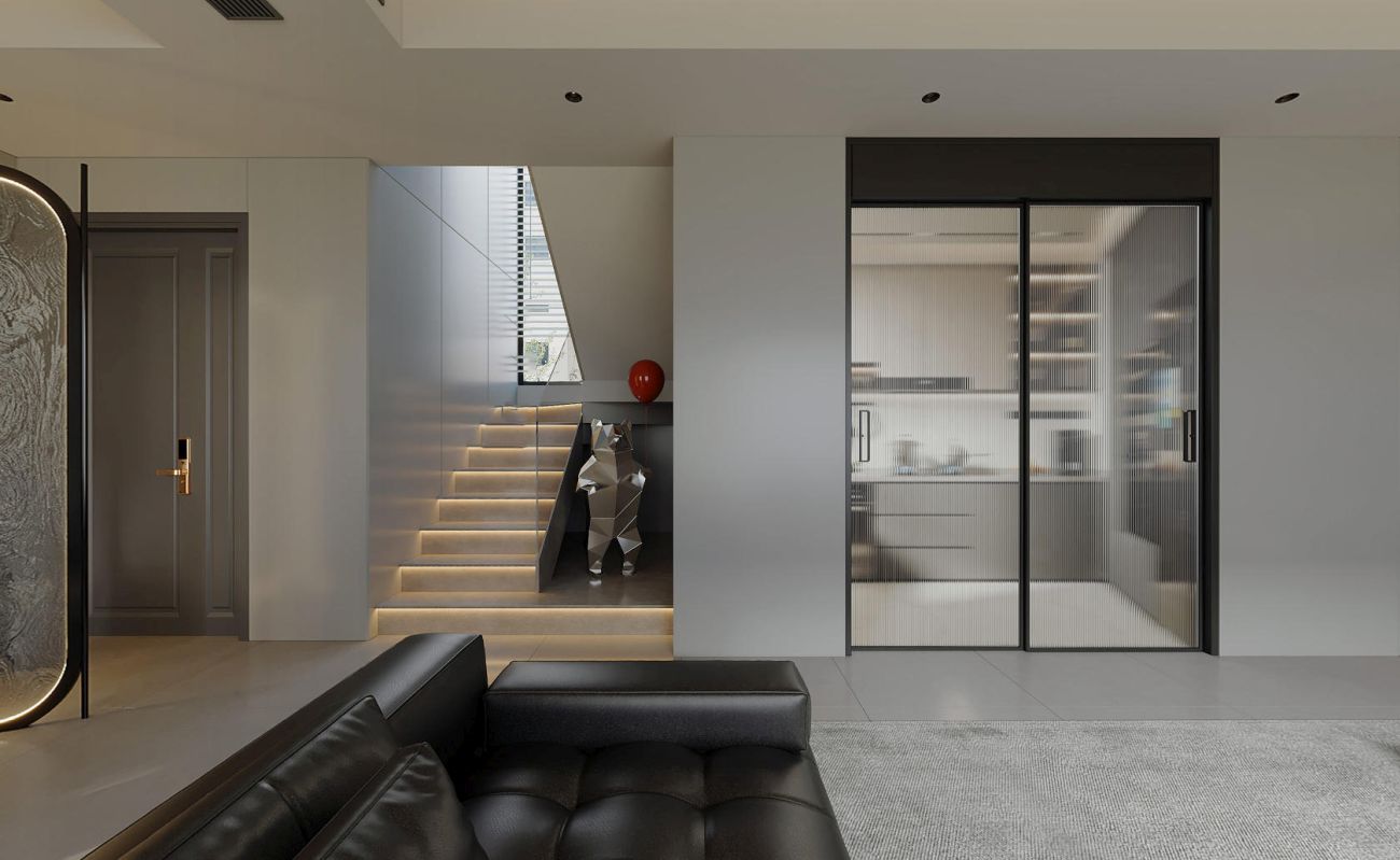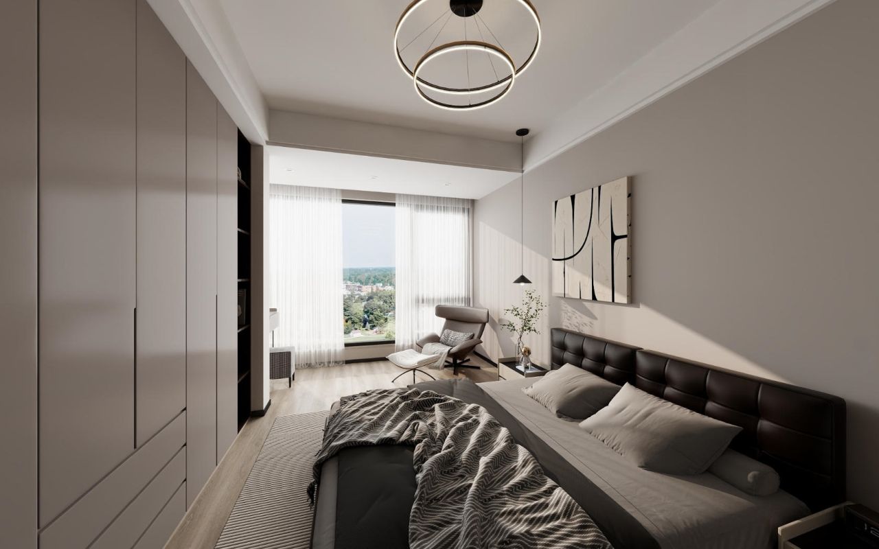 主卧以理性的黑白灰为基调,睡眠区适当减轻黑色的比重,增加空间的舒适度,营造出恰到好处的放松氛围。次卧以舒缓的笔调描绘另一种温柔,线条与块面兼容,空间布局层次分明,简约大气又不乏明亮温馨。