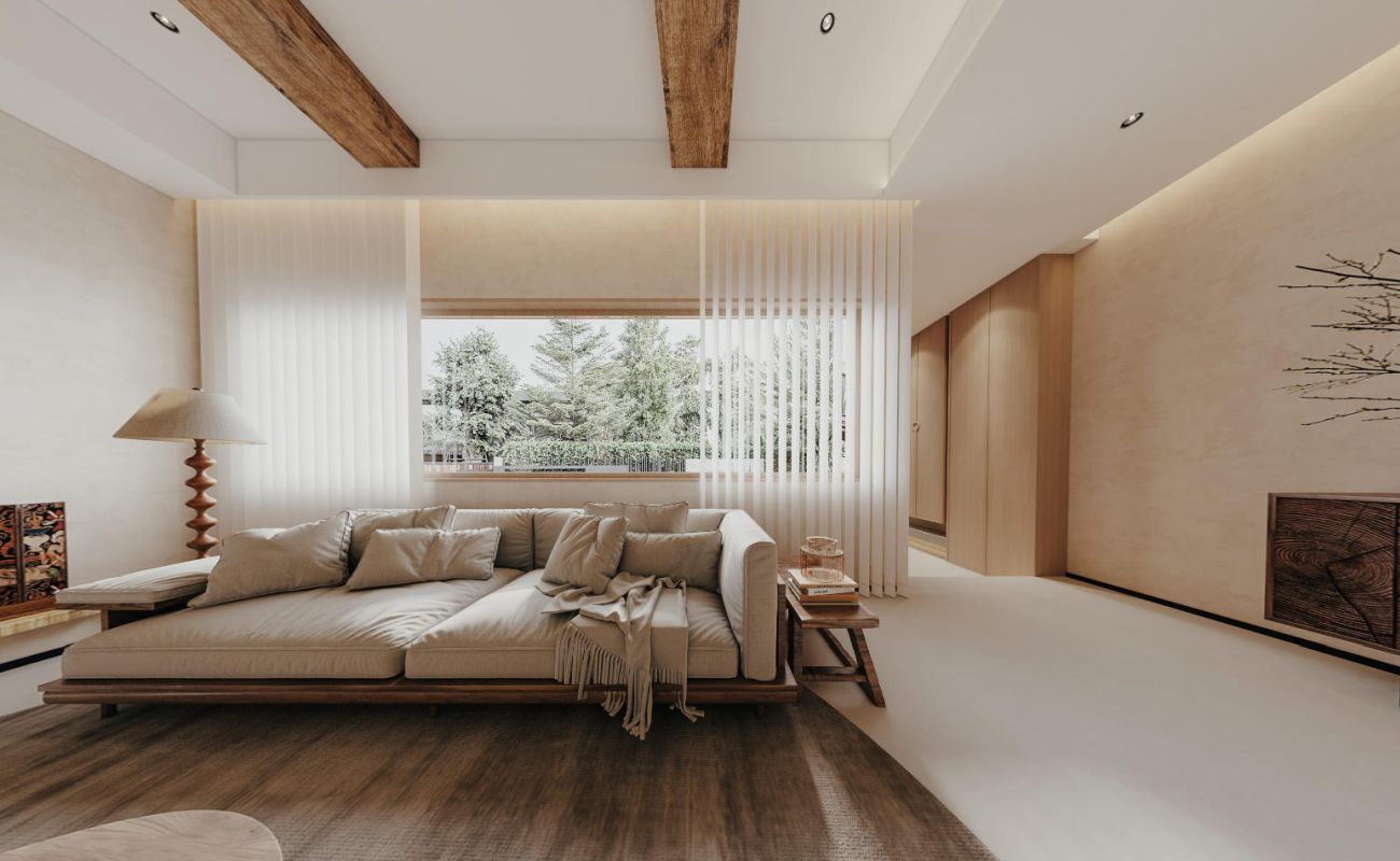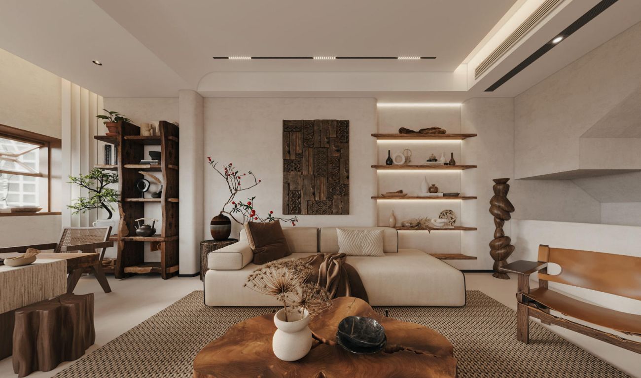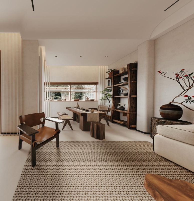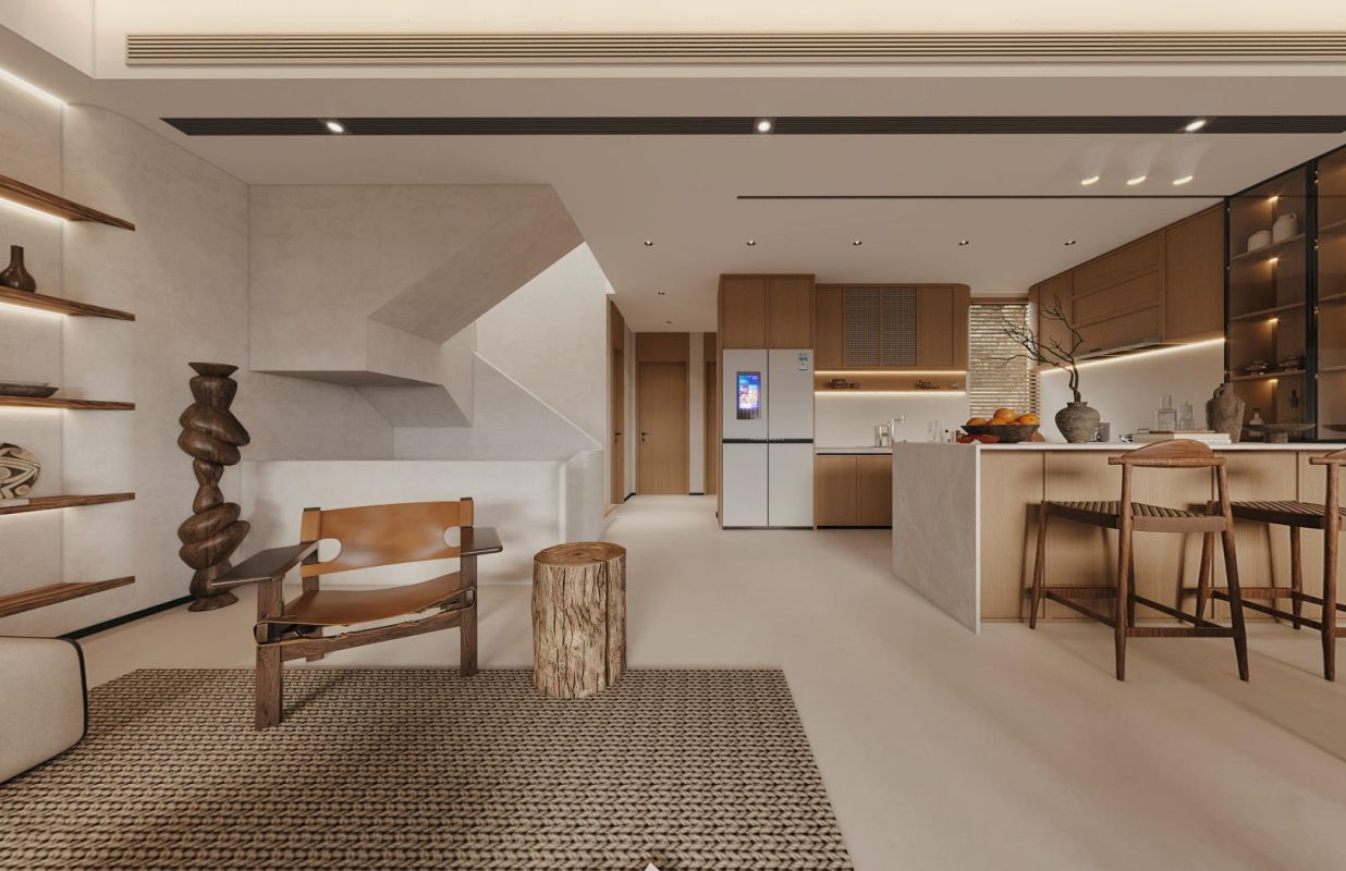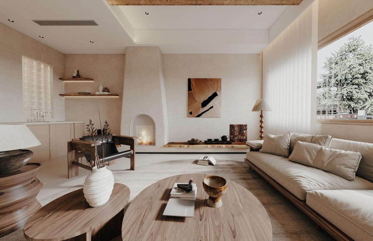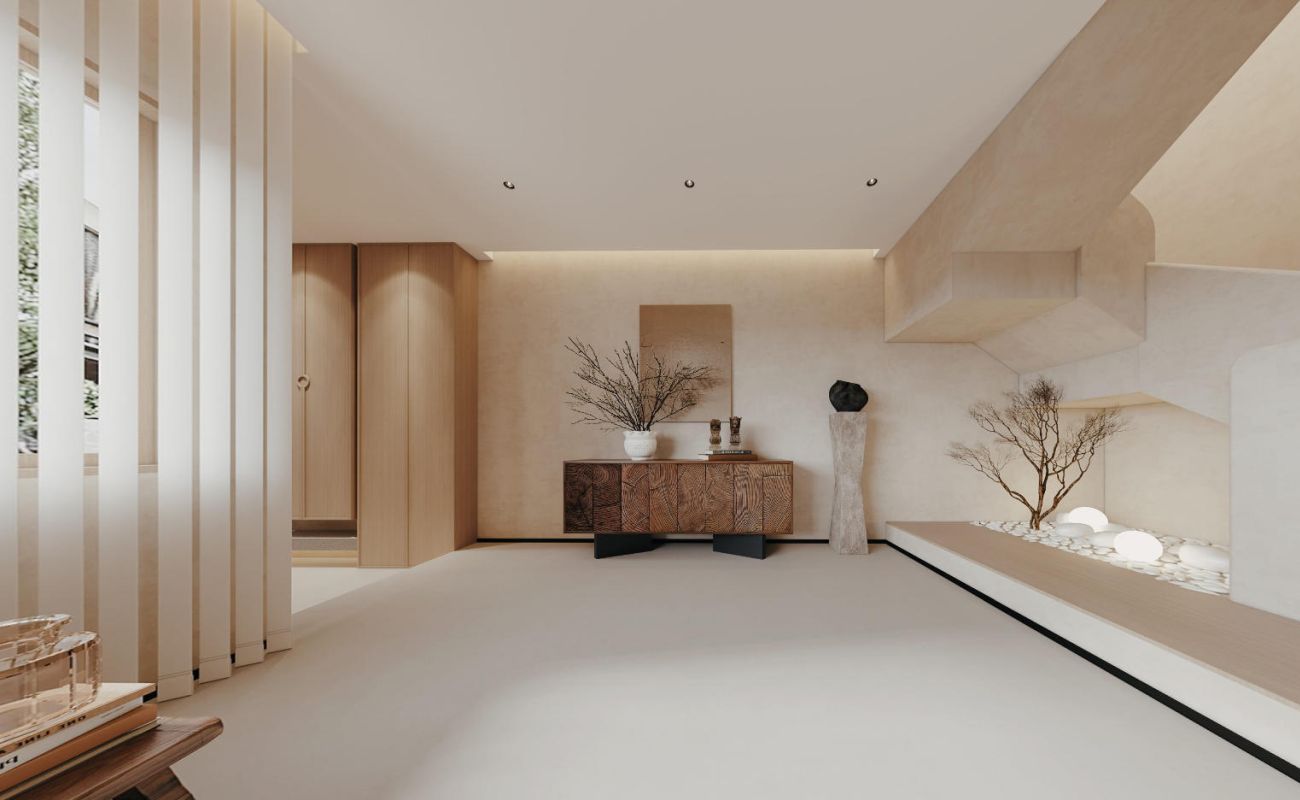 以微水泥铺陈基底,奠定质朴柔和基调,融入风化木材质,其斑驳纹理仿佛娓娓道来岁月的故事。墙体的异型窗洞赋予视觉轻盈感,构成一幅“画中景”,契合侘寂风所追求的不完美之美。