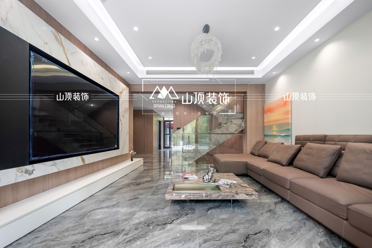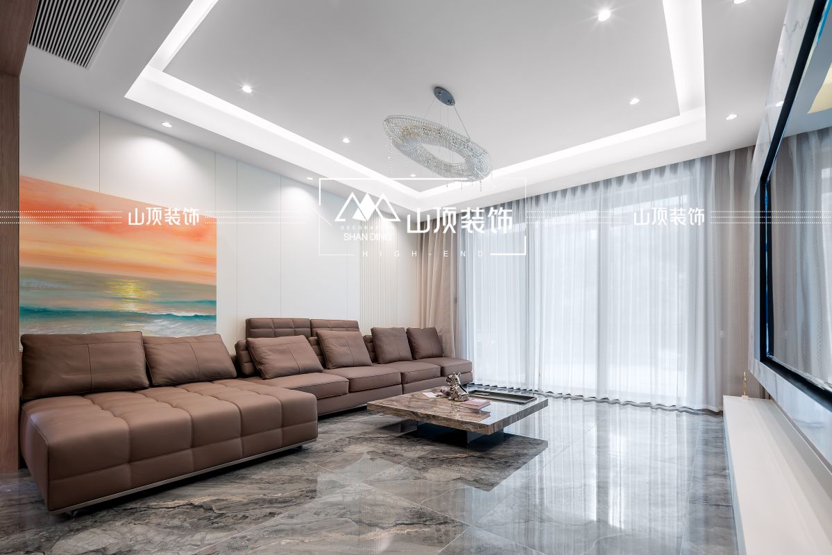 富有流动感的灰色瓷砖铺陈开来,奠定了空间现代而沉稳的基调。棕色沙发的暖意恰到好处地中和了地面的冷静。采光设计巧妙,大面积窗户引入充足自然光,搭配轻柔纱帘,光影交织,让空间更显灵动。