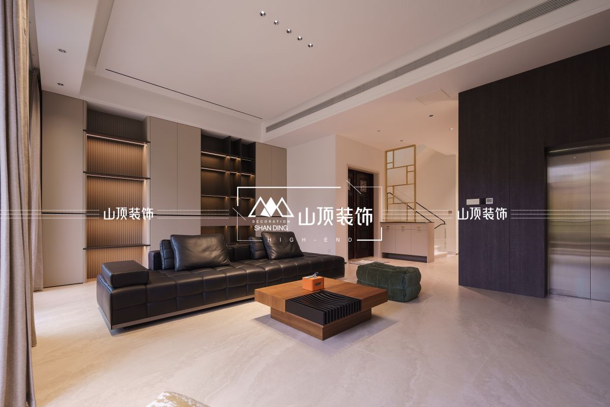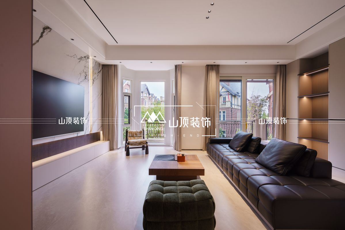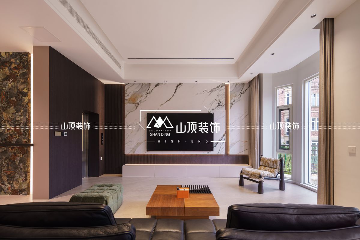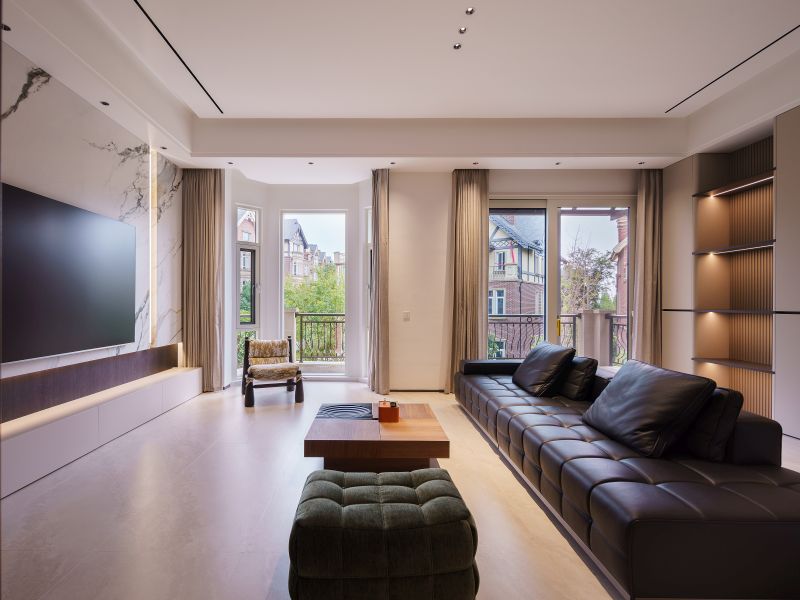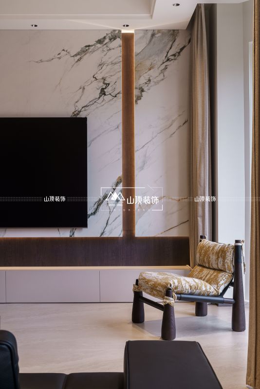 客厅延续现代意式风格,电视背景墙选用白色石材,纹理如山水画卷,与深色木饰面、嵌入式灯带形成材质与光影的对话。
