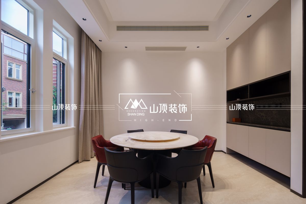 餐厅区域,圆形餐桌搭配黑红撞色座椅,既显时尚又增添活力,转盘设计方便日常用餐。两侧大窗引入充足自然光,搭配浅色窗帘,空间通透明亮。厨房采用U型布局,白色与浅咖橱柜简洁利落,石材墙面提升质感,嵌入式家电与无主灯设计让空间更显整洁有序。