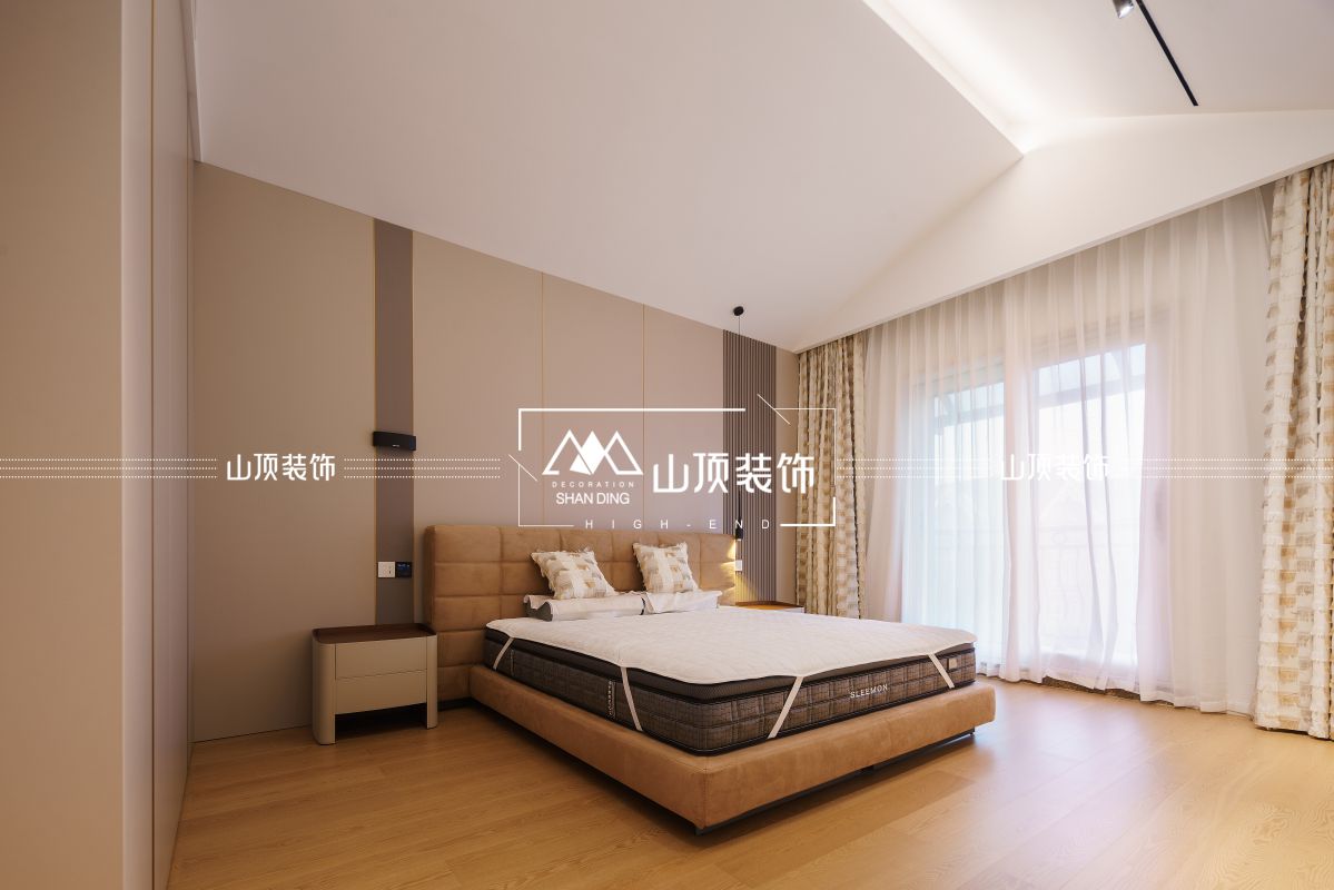卧室以简约设计诠释空间的本真之美,无主灯设计以隐藏光带与局部吊灯勾勒空间轮廓,日间柔光透过纱帘倾泻,夜间暖调灯芒晕染,形成昼夜交替的诗意韵律。