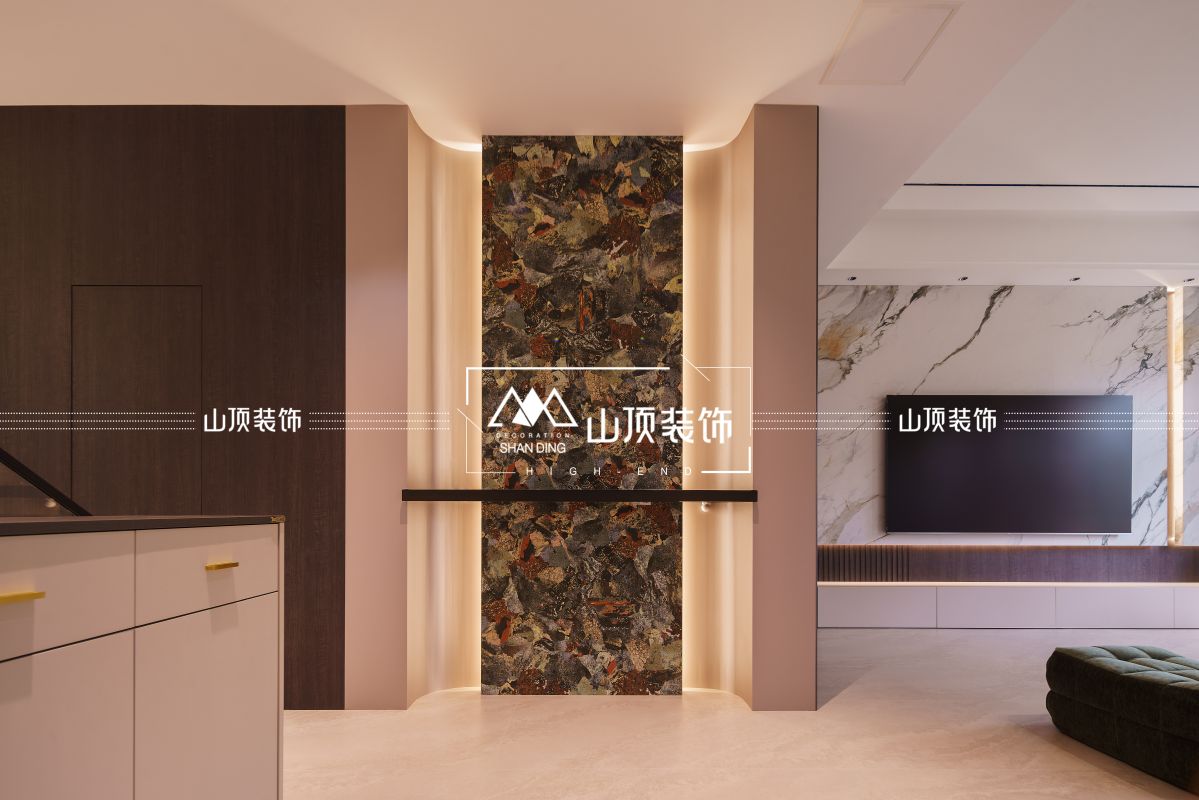 入户端景以艺术手法营造归家仪式感,特殊纹理石材与暖光灯带勾勒轮廓,悬浮台面兼顾收纳与轻盈感。端景与客厅动线呼应,融贯功能与美学。
