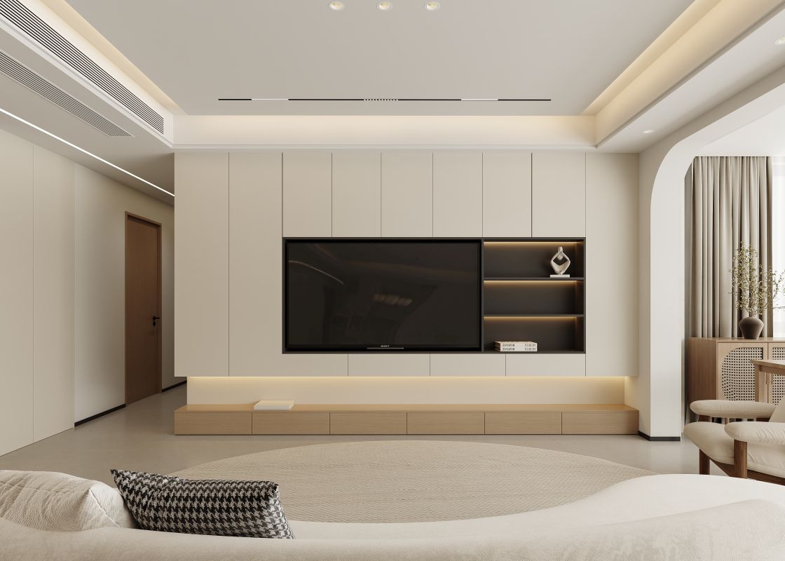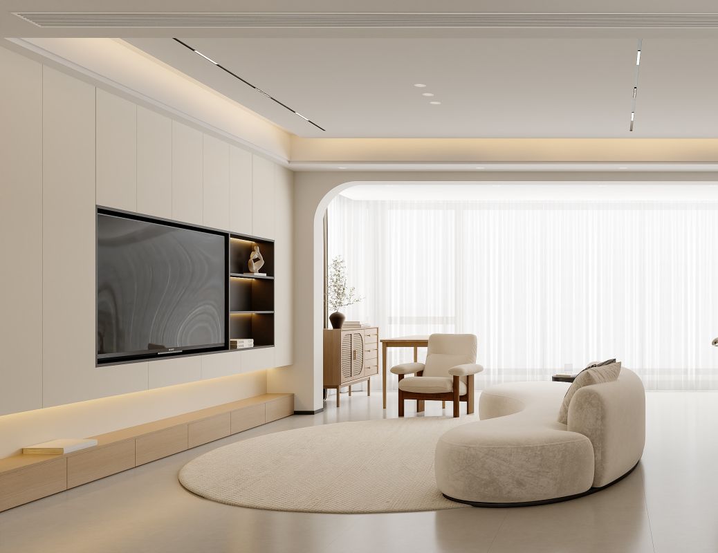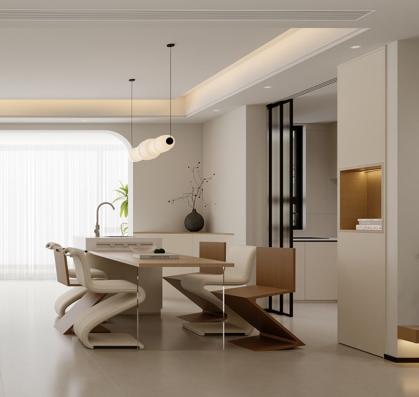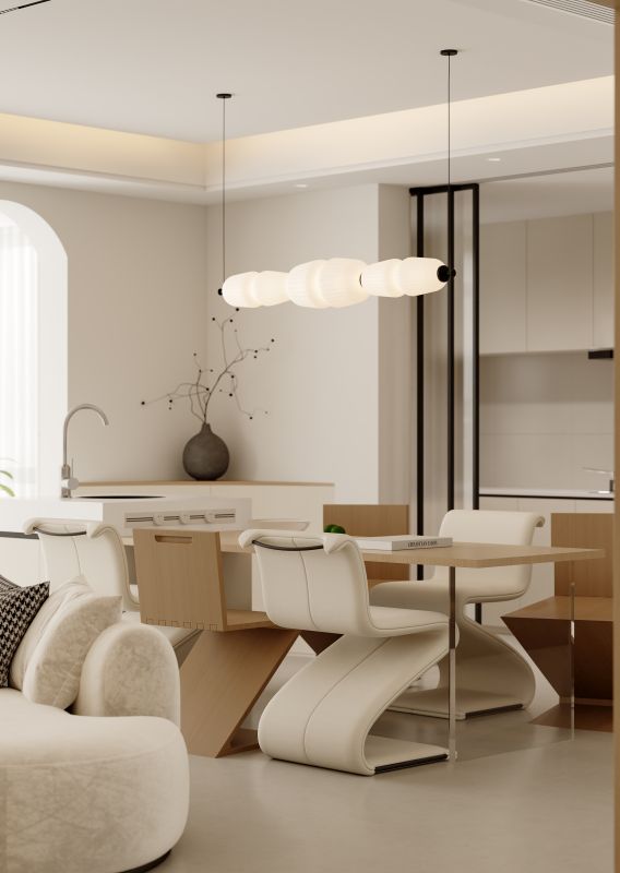 打破传统界限,客餐厅以一体化布局构筑出一个澄净温润的生活场域。设计上大量运用曲线语言:餐厅内,云朵堆叠般的吊灯轻盈垂落,与Z型椅的流畅弧线相映成趣;客厅中,弧形沙发如涟漪般围合出温馨的交流场域,搭配肌理丰富的编织地毯,为极简空间注入手作温度。