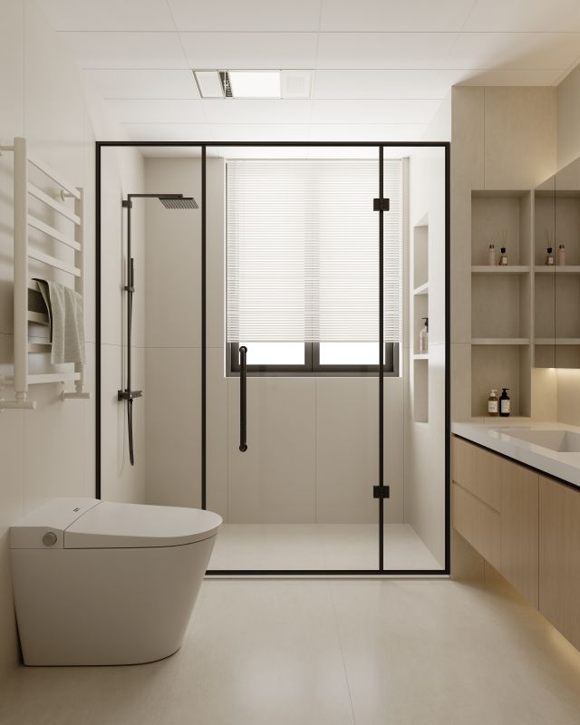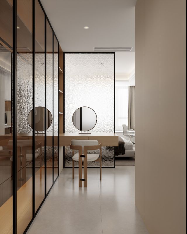 卧室与衣帽间之间以冰晶玻璃隔断划界,既维系空间开敞度,又令光线自如流淌,营造出通透轻盈的视觉氛围。主卫以简约现代的设计演绎精致生活美学,浅米色基调铺陈温暖洁净氛围,暗藏灯带与百叶窗光影交织,在开放与私密间觅得平衡,打造出令人放松的洁净仪式空间。