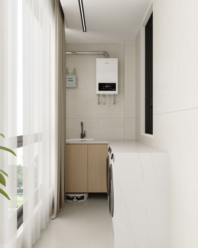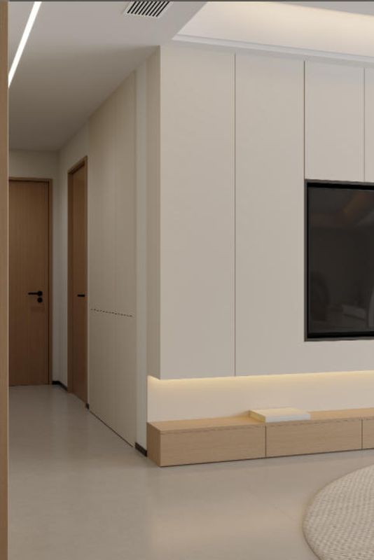 本案在材质与色彩上遵循日式美学,温润木质、柔光地面形成微妙对比。色彩以米白为基底,木色为韵,佐以黑色细节点缀。干枝与绿植成为自然的画笔,悄然模糊了室内外的边界。