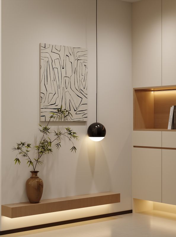 玄关柜采用挑空设计,在满足收纳需求的同时,以悬浮之姿化解了入户处的压抑感。棕色陶罐与细枝绿植点缀,以疏朗的形态与墙面的抽象画作形成虚实对话,在简约的起笔处,勾勒出禅意盎然的生机。
