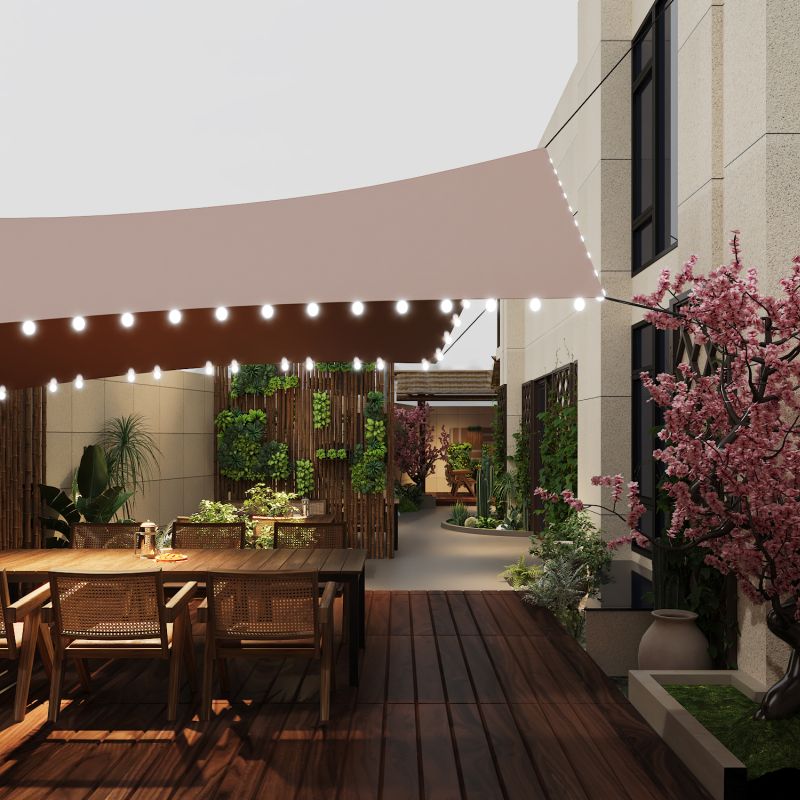 户外花园以东方禅意为骨,自然生机为韵,铺就一方都市里的诗意茶境。竹影围合出静谧天地,花木错落成趣,木桌藤椅静候茶客,圆窗映桃、灯串缀檐,每一处都藏着中式雅致。