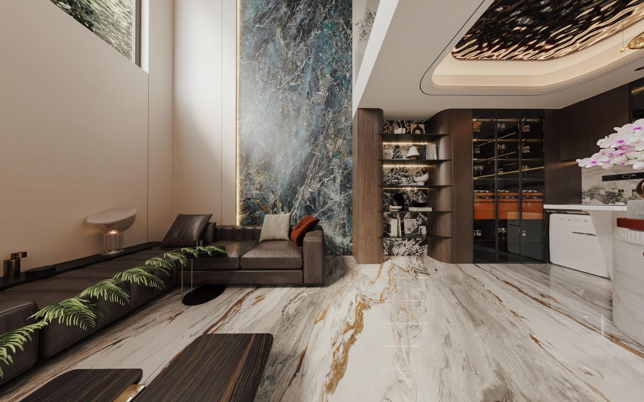 L 型皮质沙发划分出惬意的休闲区域,吧台区域的水波纹艺术吊顶,以独特的造型和金属质感,为空间注入灵动与奢华气息。影音室以玻璃移门与外部空间相隔,隔绝声音的同时保证采光与室内通透感。