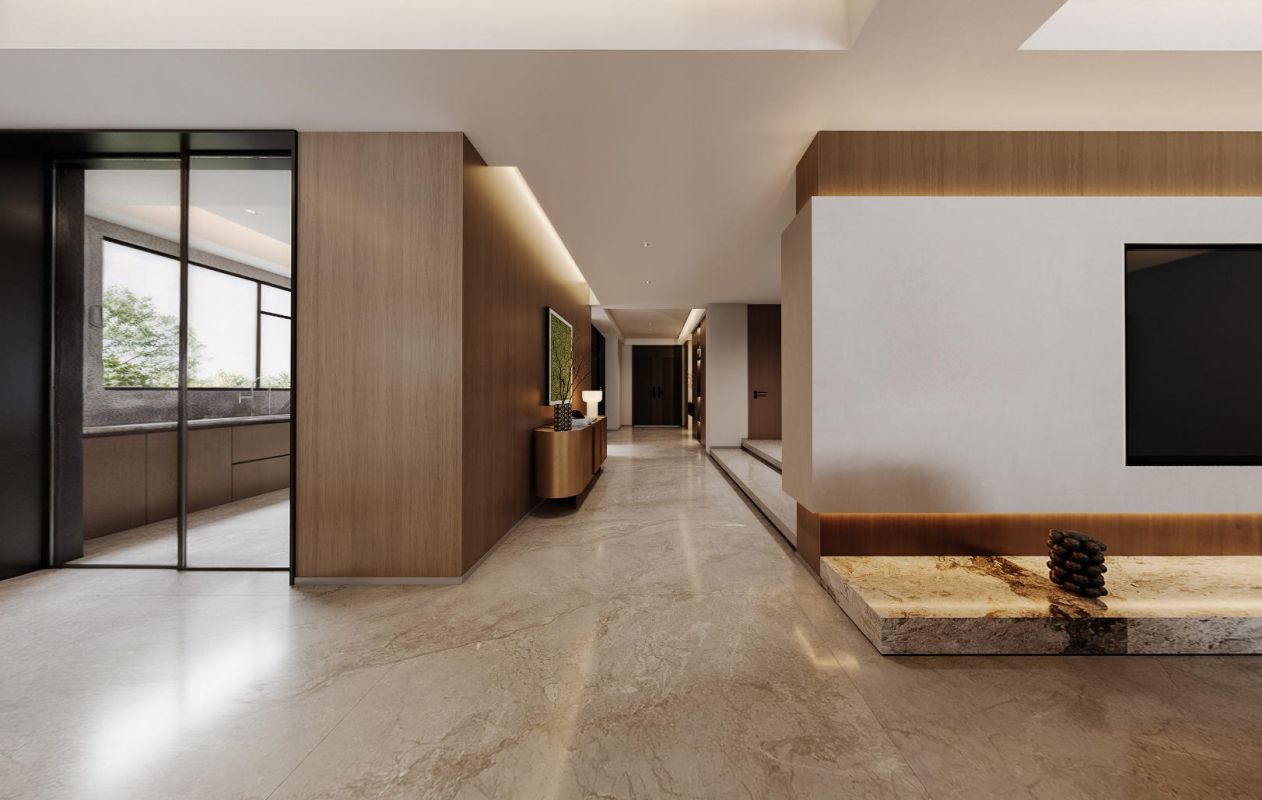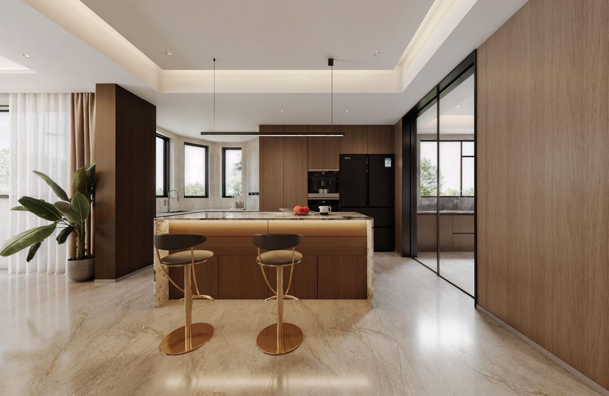 客餐厅、茶室与半开放式厨房共同围合出一个通透开阔的全屋活动场域,赋予大宅松弛自如的氛围。全屋采用无主灯设计,搭配原木色墙板有效拉伸层高视觉;