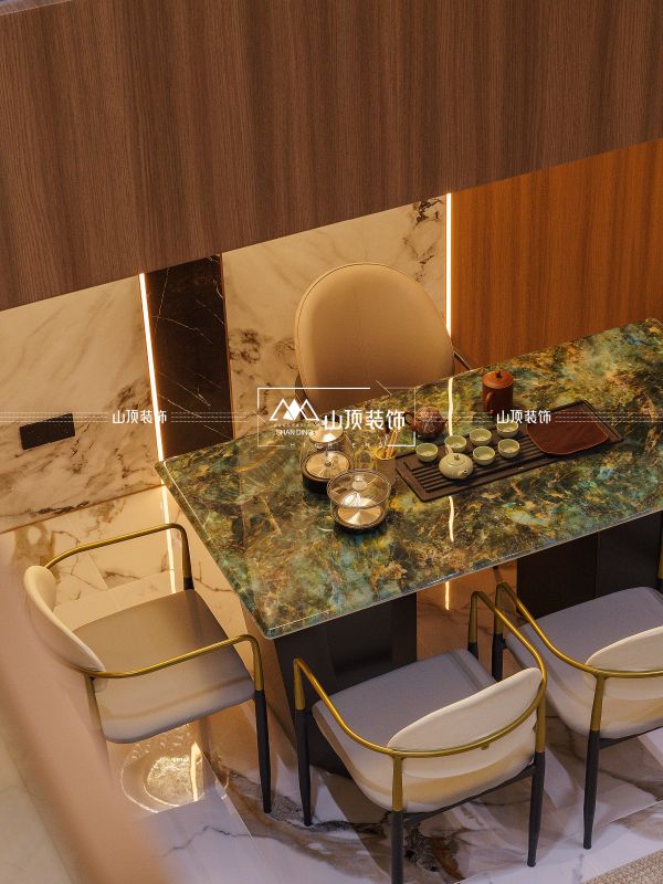 地下室空间凭借挑高设计尽显大气磅礴。步入其中,豪华水晶吊灯自高处垂落,熠熠生辉。大理石花纹的墙面与地板相互映衬,纹理自然,质感十足,尽显高雅格调。一侧的茶室区域,精致茶具摆放于绿色桌案之上,营造出静谧的品茗氛围。 木纹地砖通铺营造温润基调,儿童休闲区内,彩绘绒布地毯与蓝紫色拼接条纹沙发勾勒出活泼氛围。透明金边玻璃围栏,可将视野延伸至负一层。 紧邻的办公区沿墙设置通顶柜,黑色玻璃展柜陈列着证书与艺术品,搭配米色办公桌椅,兼顾实用与美观。