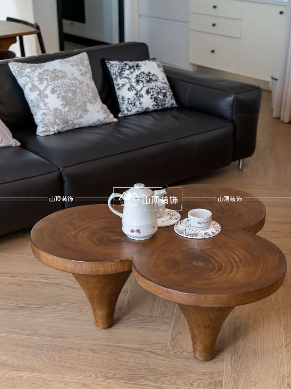木色长桌与茶几相互呼应,一旁就是餐边柜和厨房,生活动线十分合理便捷。