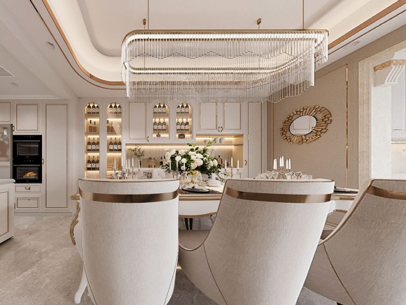 餐厅秉持典型的法式风格搭配原则,餐桌和餐椅均为米白色,表面略带雕花。配合扶手和椅腿的弧形曲度,显得优雅矜贵,空间中浪漫清新之感扑面而来。