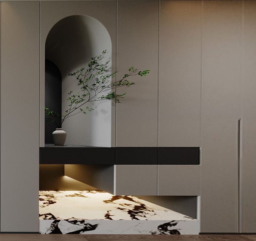 卧室采用"功能分区+视觉延展"的双重设计策略,以长虹玻璃隔断为界,巧妙划分出衣帽收纳区与静谧睡眠区。通过材质与色调的搭配,在空间细节中不断延展时尚的舒适与情调,塑造一个富有节奏感、延伸感、干练的居住空间。