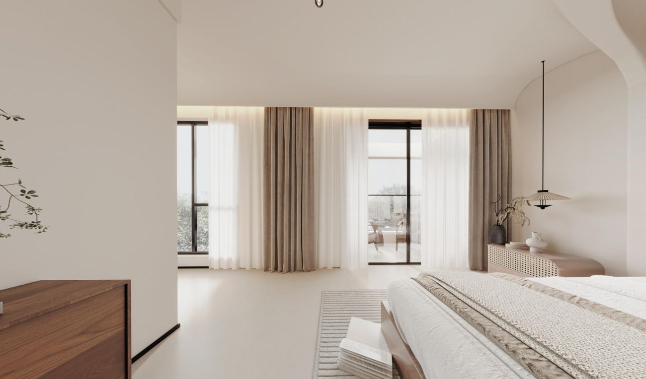 以低饱和度色彩调控空间情绪,弧形吊顶与圆角家具相辅相成,营造出柔和松弛的氛围。软装主打亚麻材质,天然织理传递朴素细腻的触感,提升层次与品质。