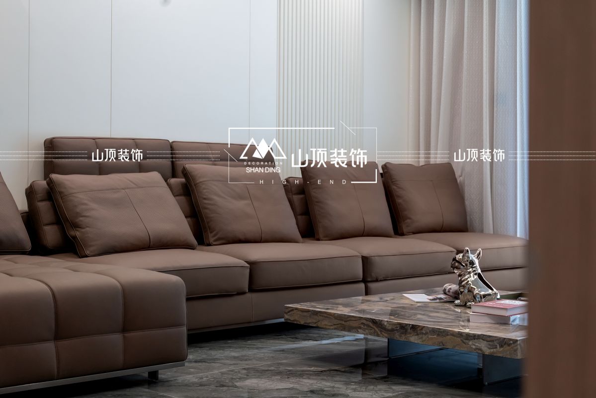 富有流动感的灰色瓷砖铺陈开来,奠定了空间现代而沉稳的基调。棕色沙发的暖意恰到好处地中和了地面的冷静。采光设计巧妙,大面积窗户引入充足自然光,搭配轻柔纱帘,光影交织,让空间更显灵动。