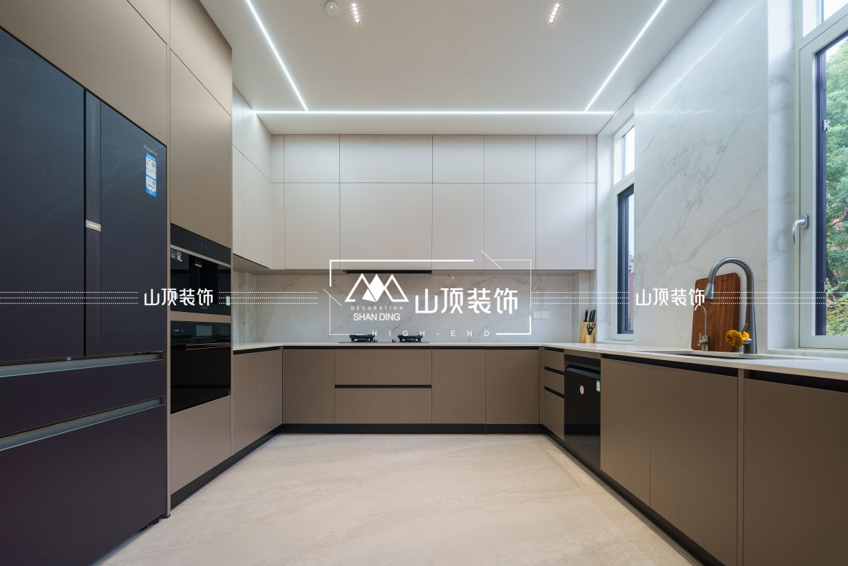 餐厅区域,圆形餐桌搭配黑红撞色座椅,既显时尚又增添活力,转盘设计方便日常用餐。两侧大窗引入充足自然光,搭配浅色窗帘,空间通透明亮。厨房采用U型布局,白色与浅咖橱柜简洁利落,石材墙面提升质感,嵌入式家电与无主灯设计让空间更显整洁有序。
